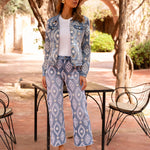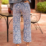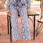 Jean wide leg bleu clair avec un motif brodé blanc de style ornemental sur l'ensemble du pantalon