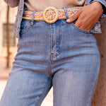 Jean wide leg bleu clair avec une ceinture tressée écrue et des poches avant et arrière classiques