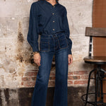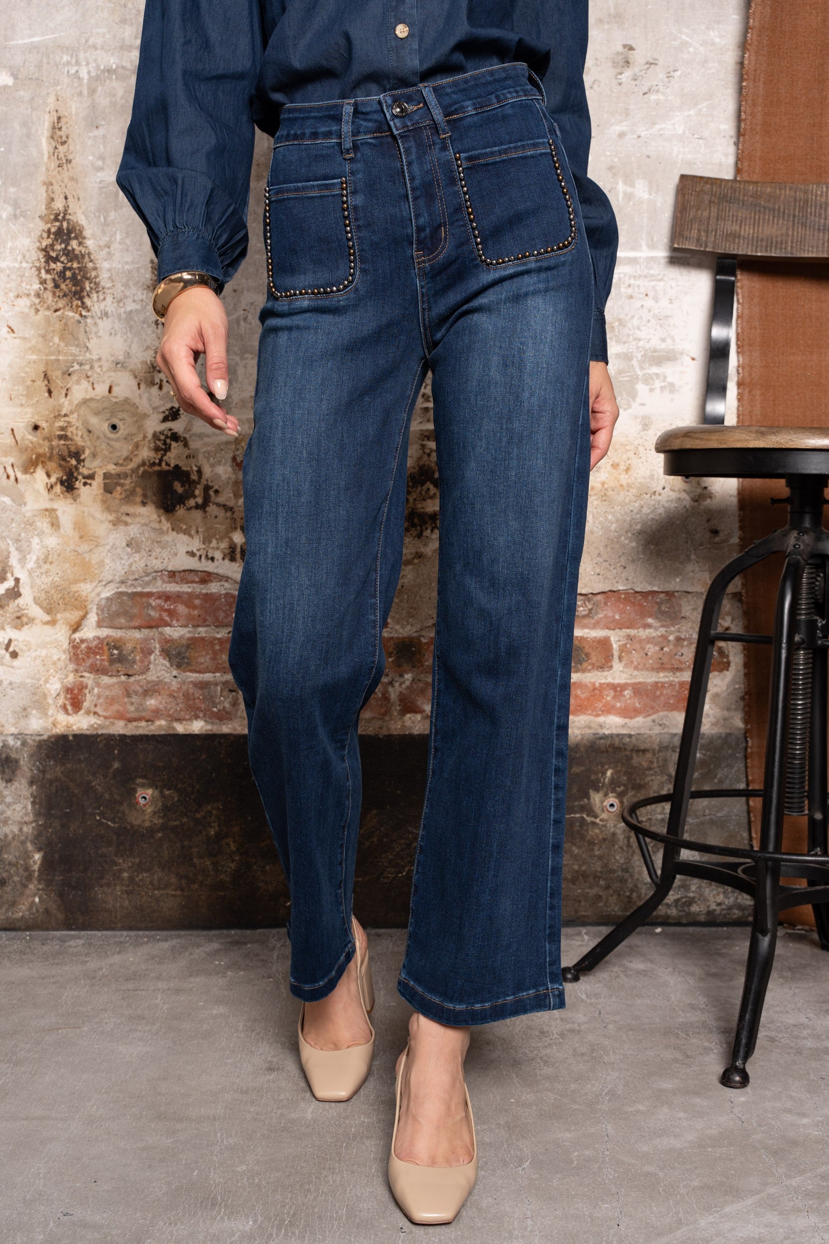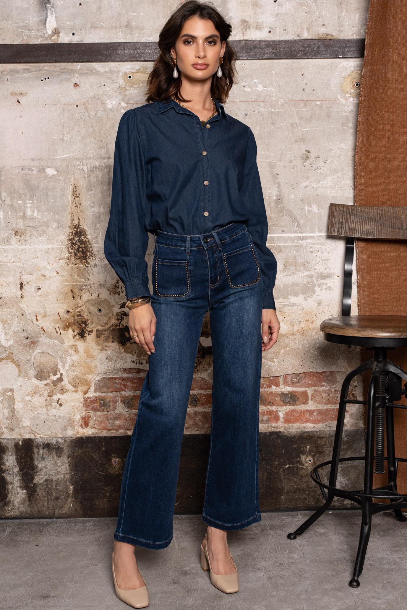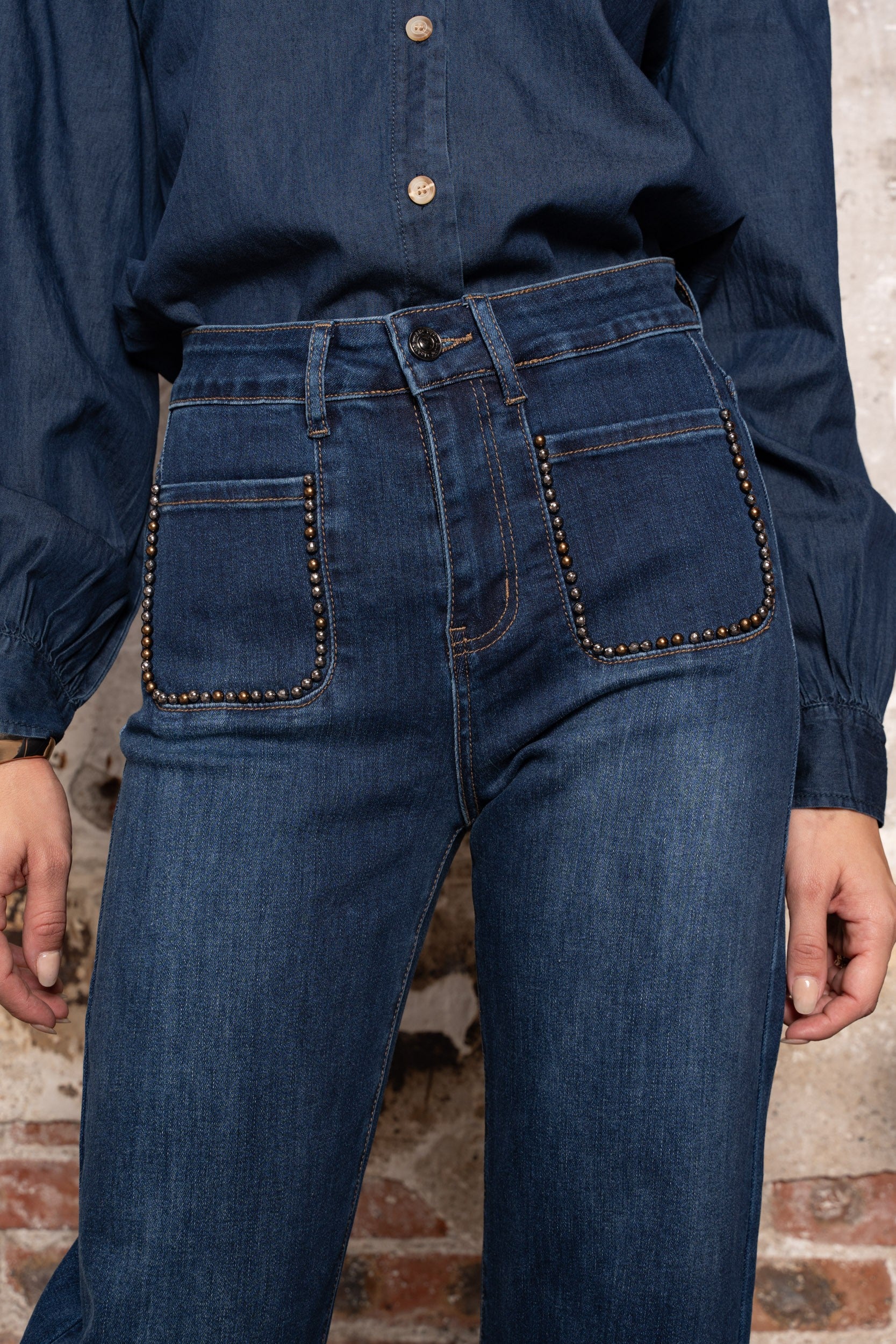 Coupe : Taille haute, jambe wide leg et poches carrées avec perles.