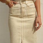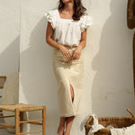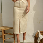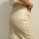 Jupe longue en denim beige avec des fils lamés dorés, présentant une fente avant pour une touche de modernité et d'élégance.