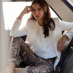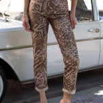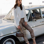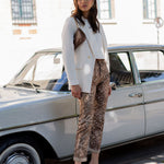 Pantalon enduit en coton stretch fourré à l'intérieur pour un confort optimal. Imprimé irisé or, coupe droite, s'adaptant à chaque morphologie.