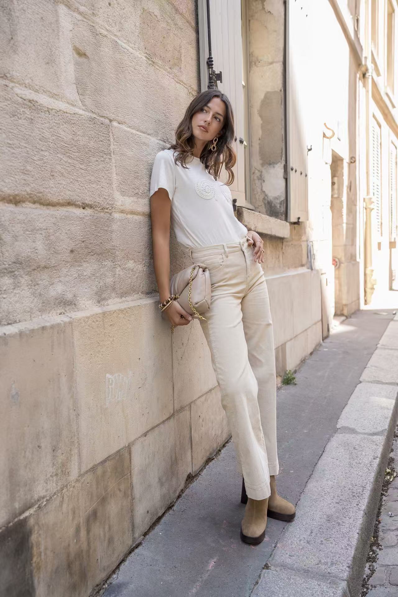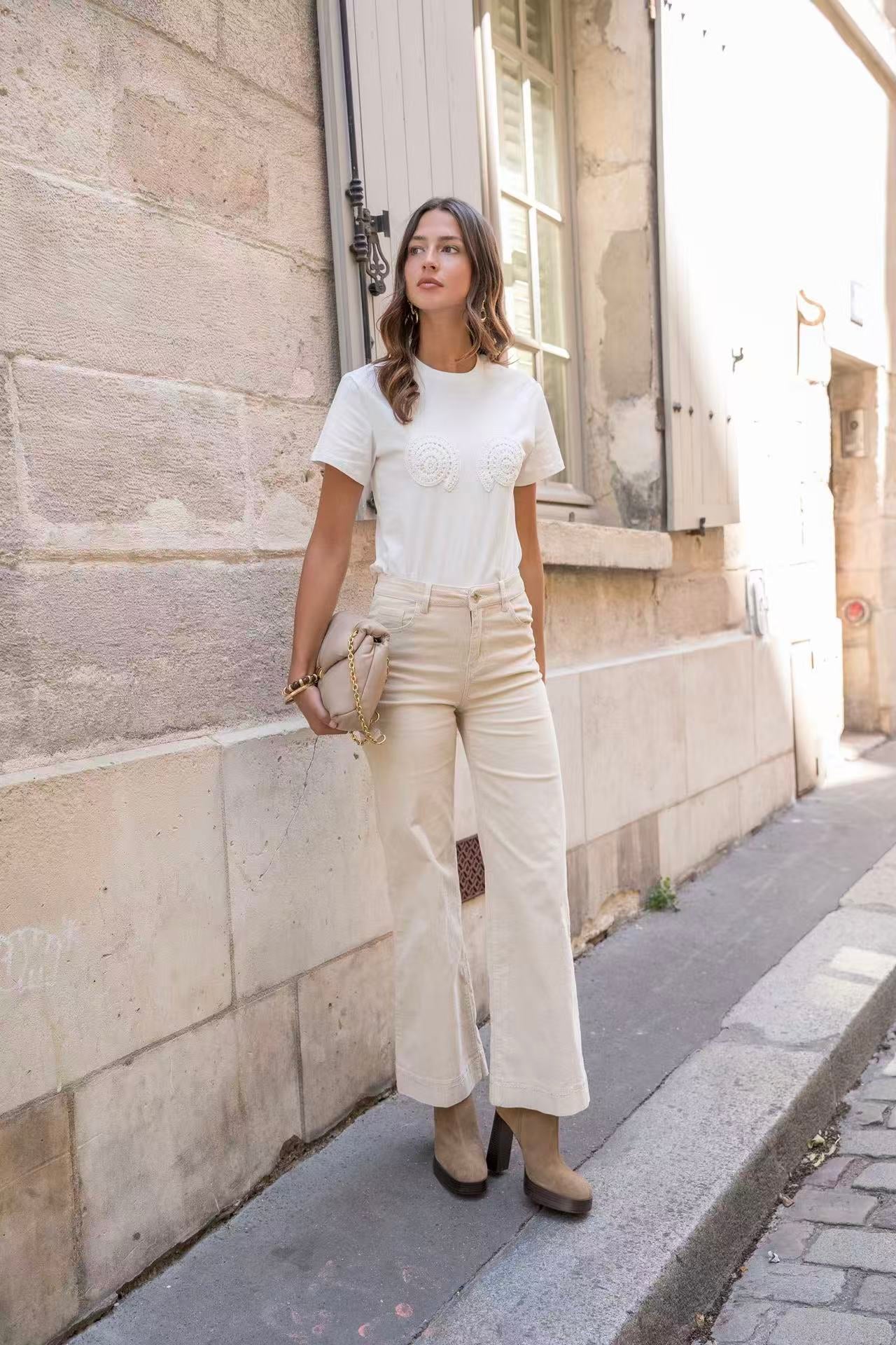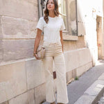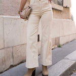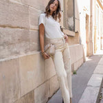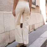 - Design: Pantalon en velours de coton stretch couleur Beige, à la coupe droit large, et avec une taille haute, donnant une allure élégante et classique à la fois aux tons chauds d'automne-hiver. Doté de poches carrés et boutons ouverture en doré et zip.