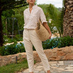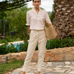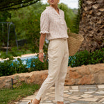 Pantalon coupe chino en lin et coton, fabriqué à partir de matières 100% naturelles pour une grande respirabilité. Il présente des poches italiennes latérales à l'avant et des poches passepoilées à l'arrière, offrant une coupe chic et un tissu naturel.