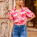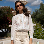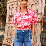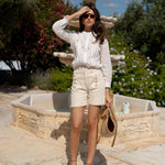 Short en denim, orné de boutons bijoux avec un contour en or et de nacres à l'intérieur.