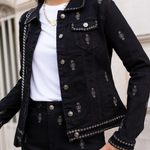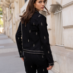 Une veste en jean noire, sublimée par une délicate symphonie de broderies. Chaque fil tisse une histoire, chaque surpiqûre une note dans cette partition de style et d'élégance.