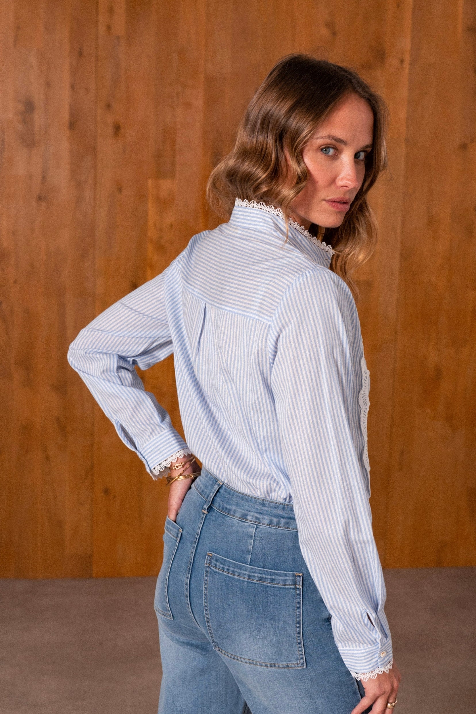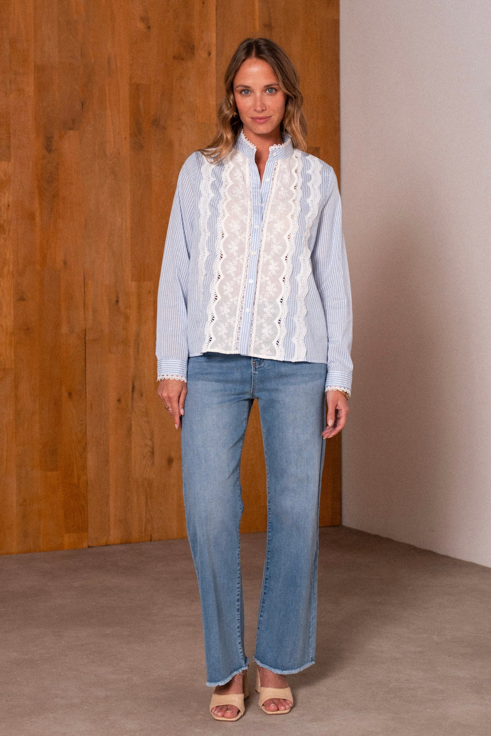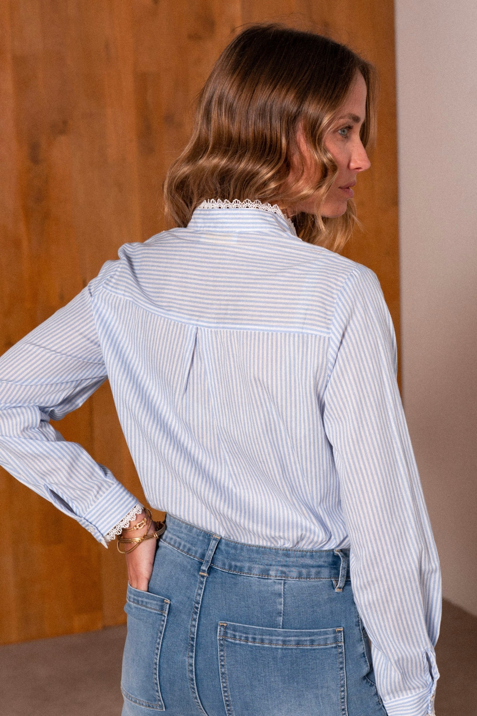 Détails : Chemisier en coton tissé à rayures bleu ciel, fermé par de délicats boutons en nacre. Finitions raffinées avec bandes de dentelle délicate le long des parementures.