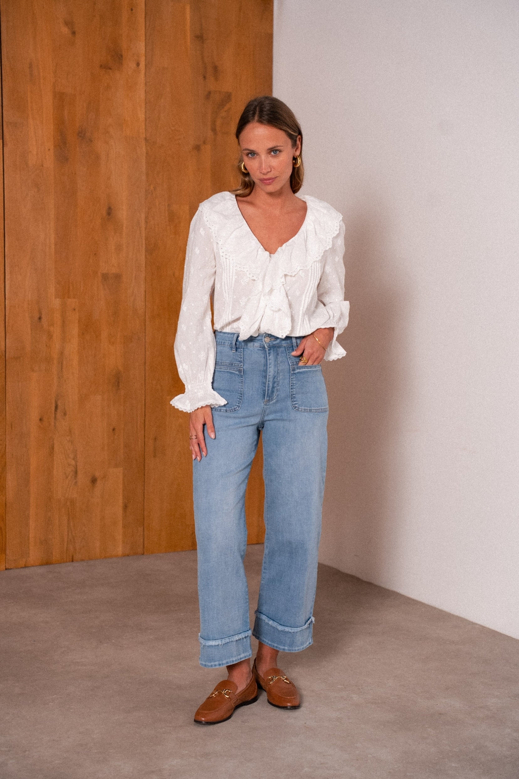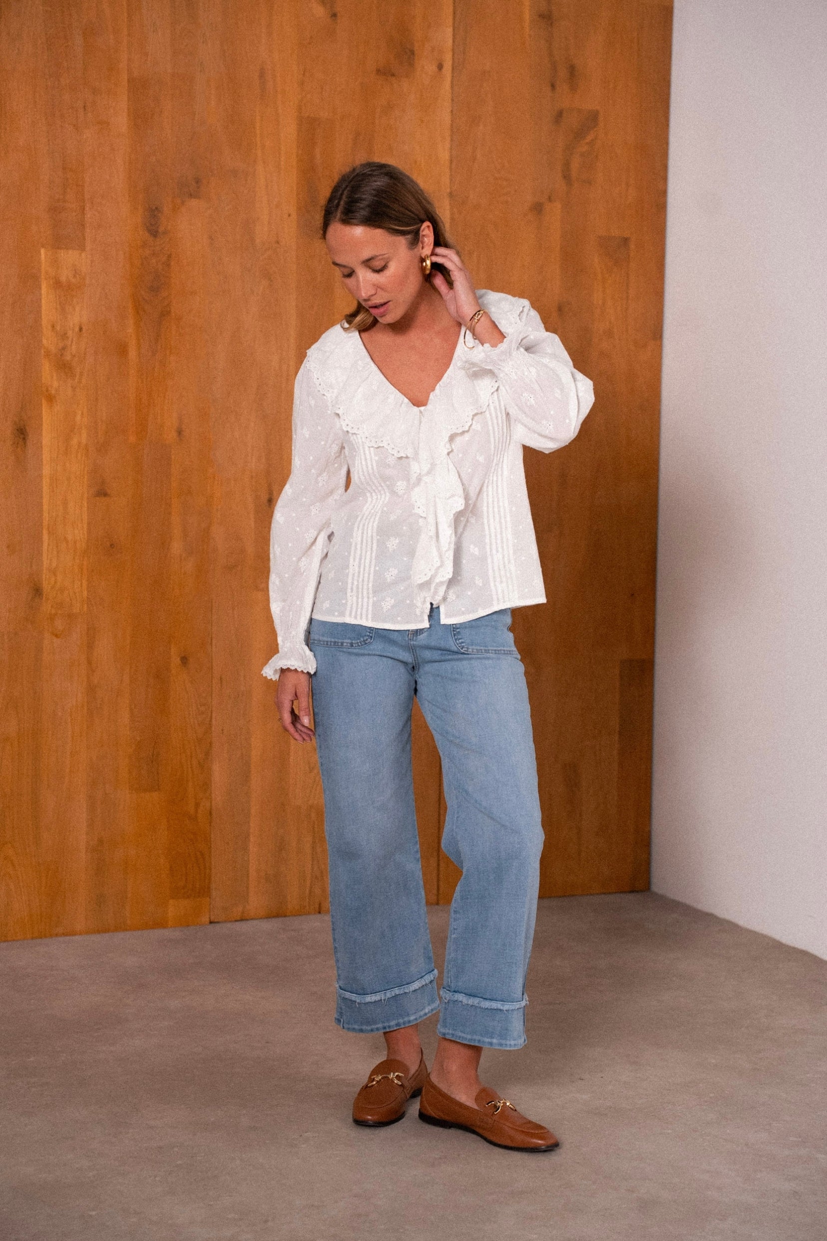 Détails : Chemisier en coton, orné de volants sur la poitrine. Broderies délicates ton sur ton et finitions en dentelle le long des volants, pour une touche subtilement travaillée.