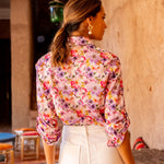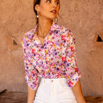 Imprimé floral multicolore sur l'ensemble du tissu, col chemise classique, manches longues avec possibilité de retrousser avec un bouton, fermeture boutonnée sur le devant.