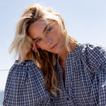 Détails : Tissu vichy bleu esprit vintage, petit col rond, boutonnage partiel sur le devant, plissé léger pour un tombé naturel