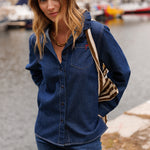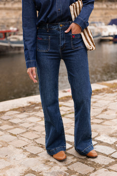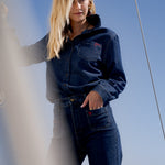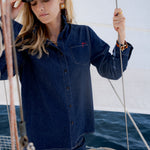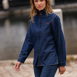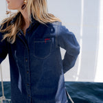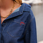 Détails : Toile denim bleu brut, col montant esprit col officier, broderie rouge subtile sur la poche poitrine, poignets boutonnés ajustables