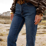 Détails : Denim brut à la teinte authentique, ceinture fournie pour souligner la taille, finitions soignées.