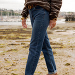 Coupe : Taille haute, jambe droite et bas retroussé pour un tombé structuré sans effort.