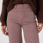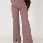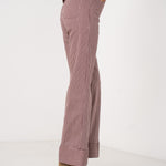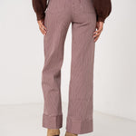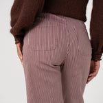 Rayures verticales bordeaux et écru, larges poches plaquées à l’avant, boutons dorés. Toile souple au confort stretch discret.