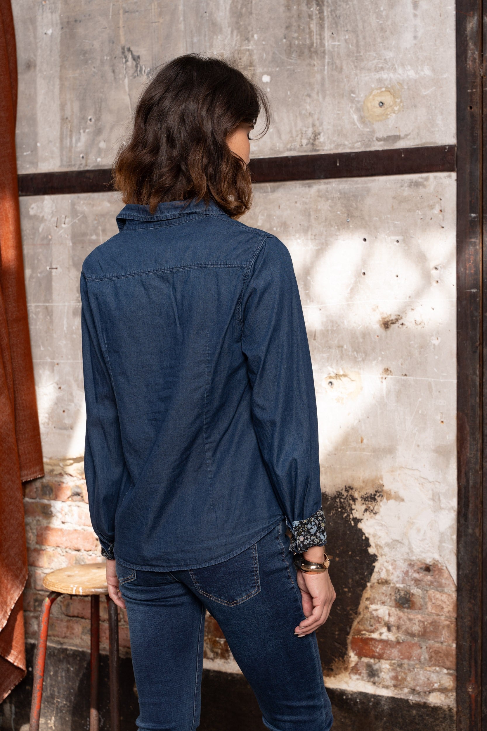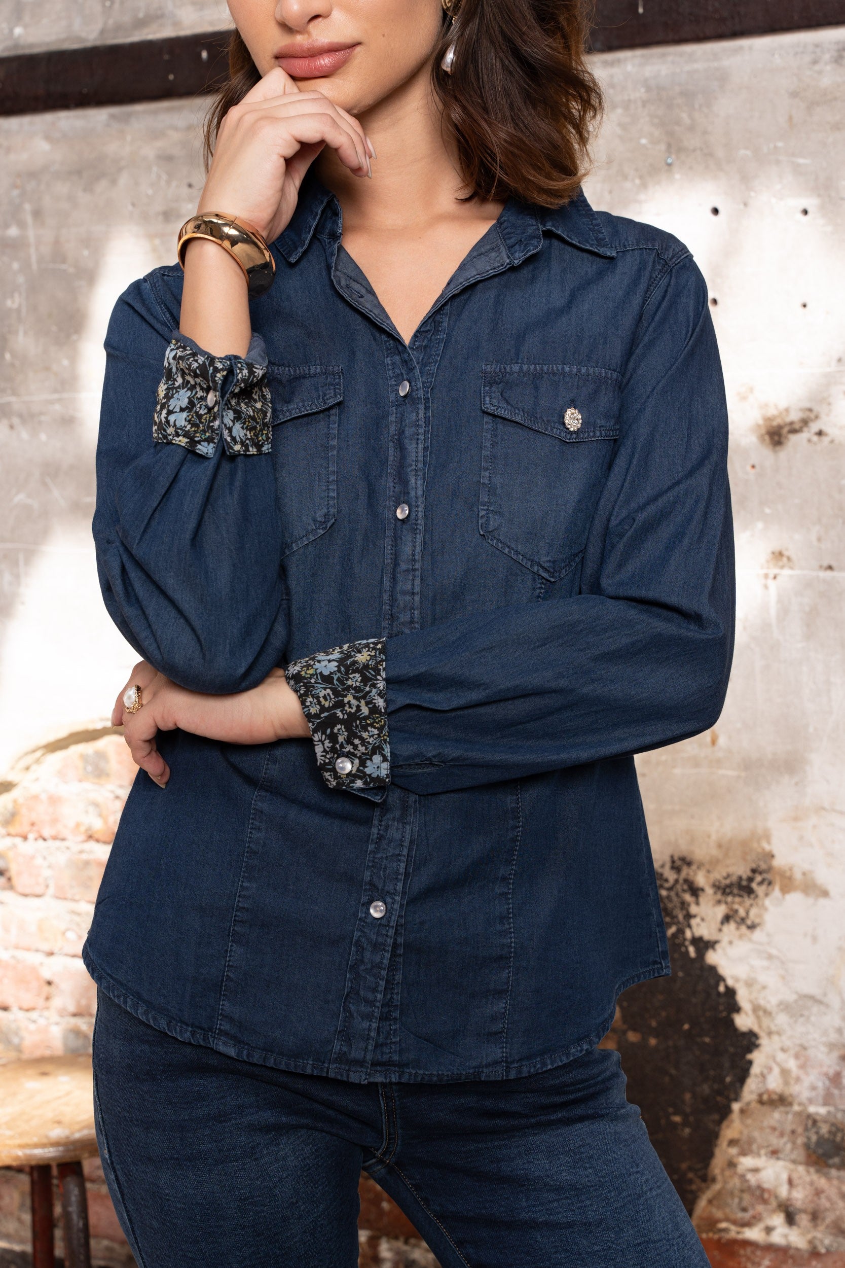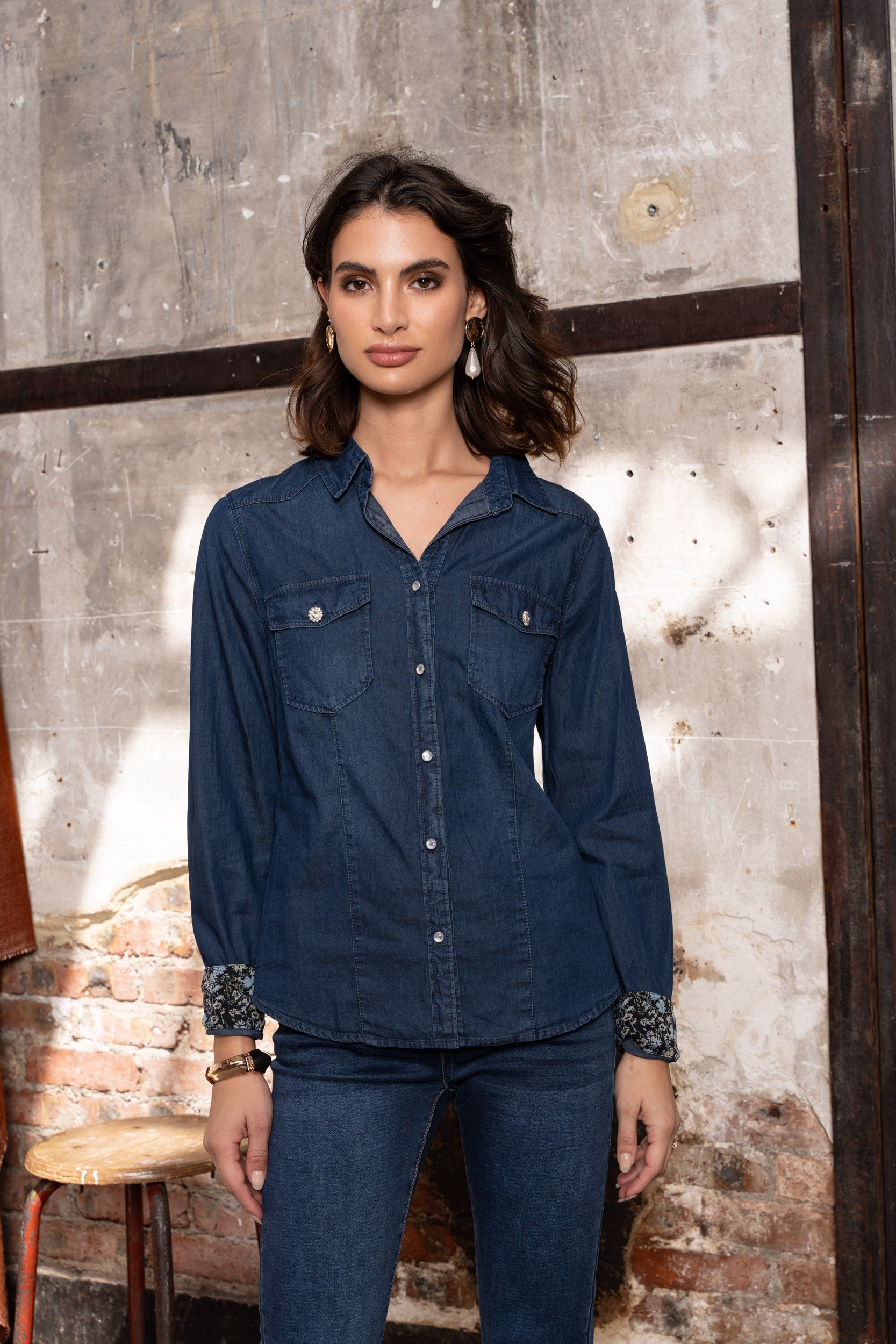 Chemise entièrement en coton avec revers de manches fleuri, ajoutant une touche de charme printanier. Les poches à rabat avant sont ornées de boutons bijoux, conférant à cette chemise une élégance subtile et moderne.