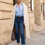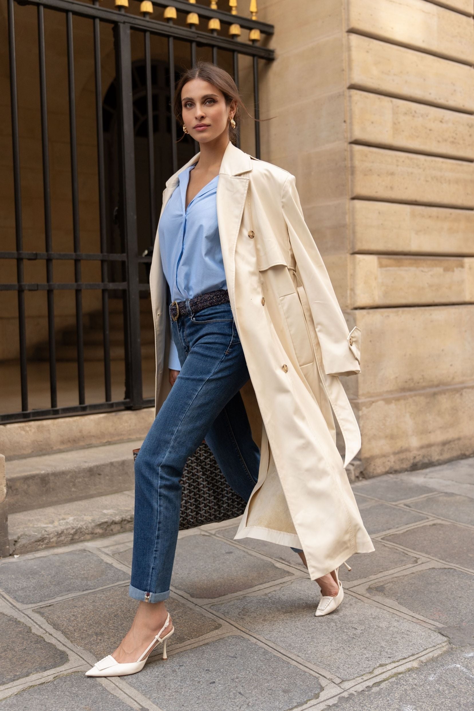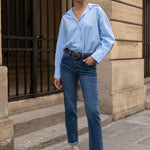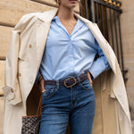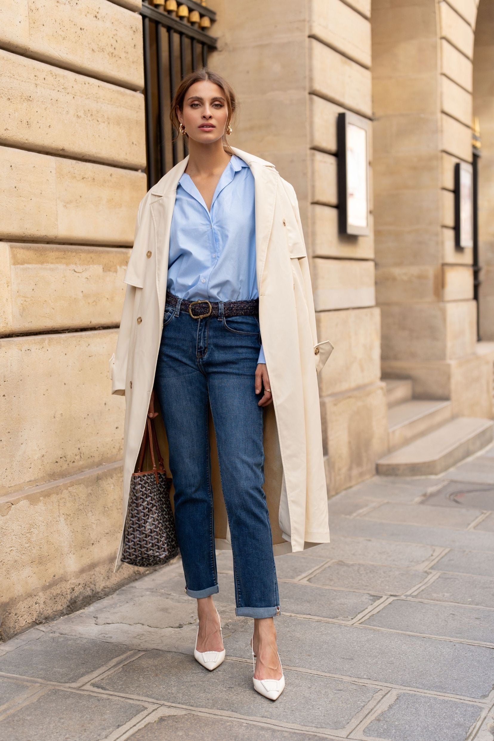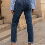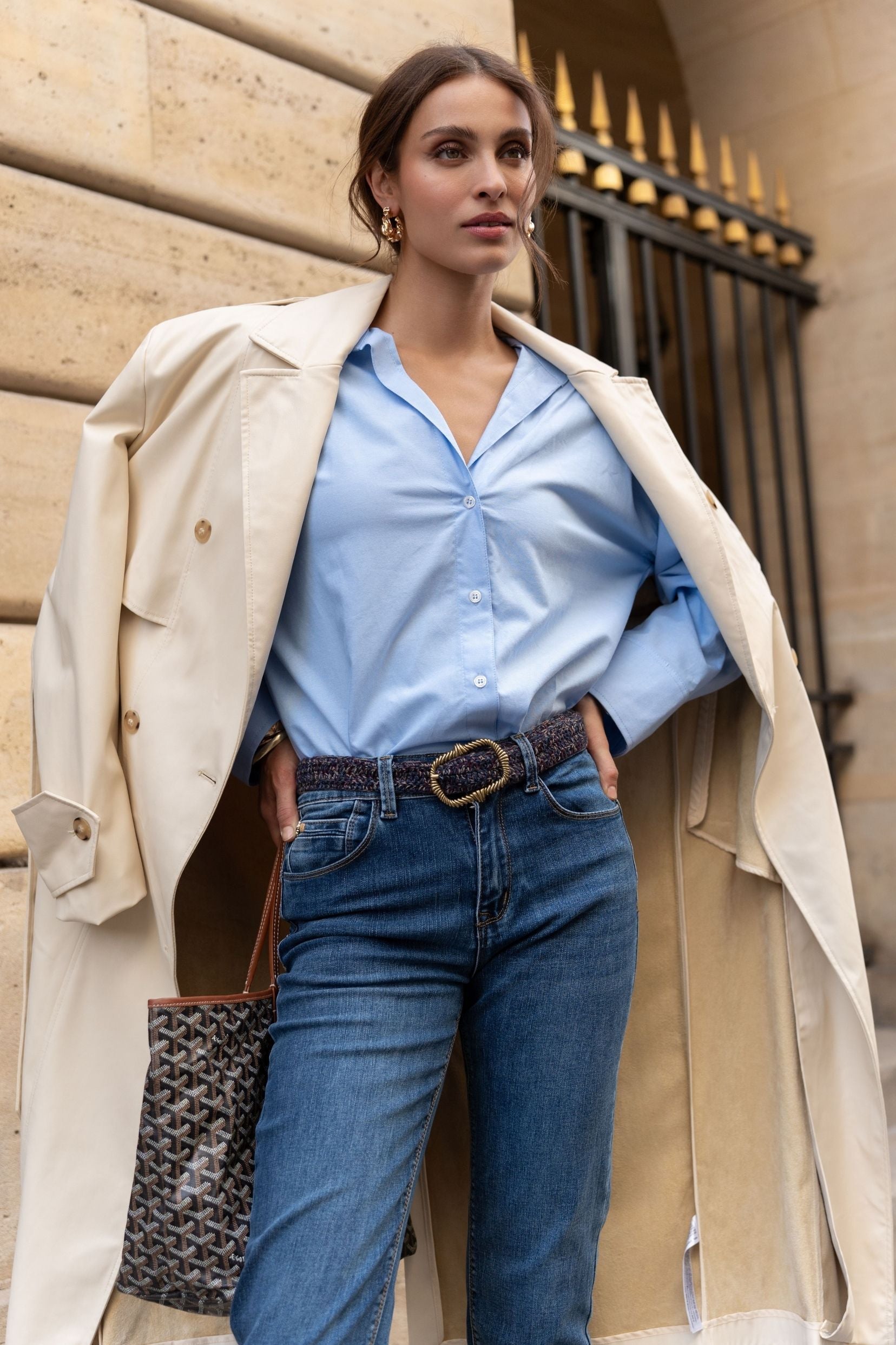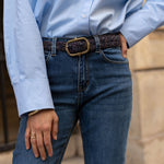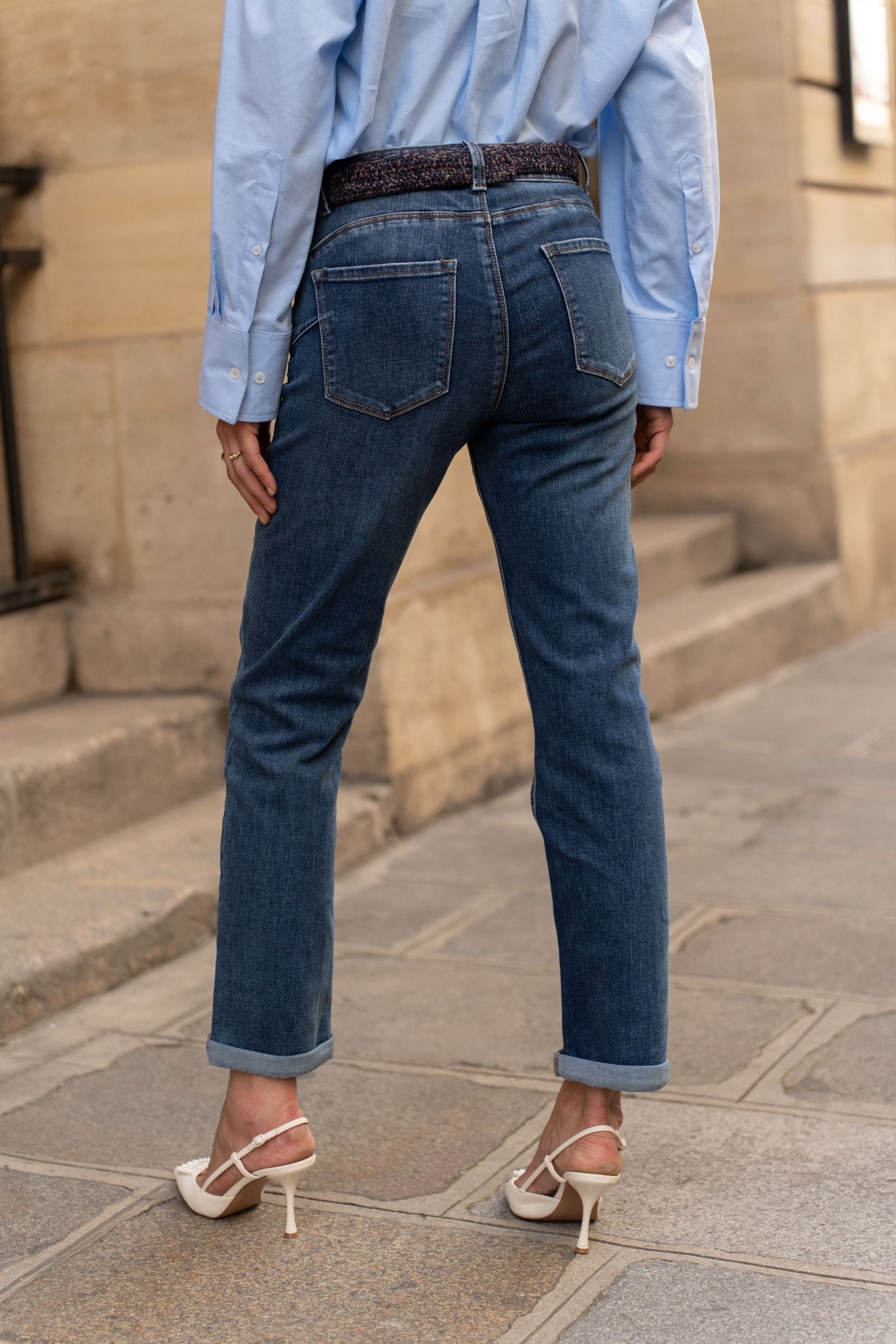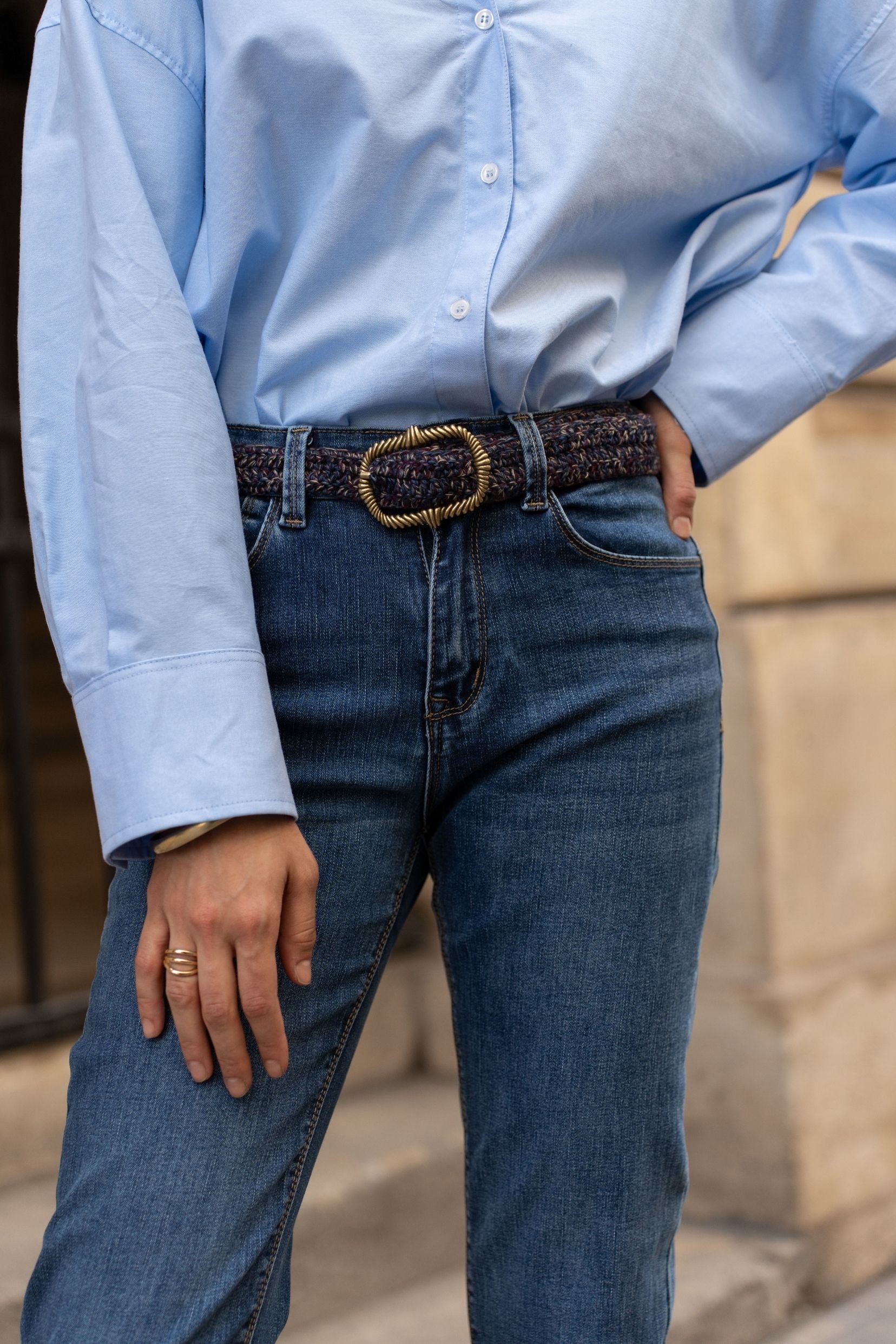 Jean coupe droite stretch, avec une ceinture en maille colorée et une boucle dorée vintage.