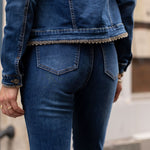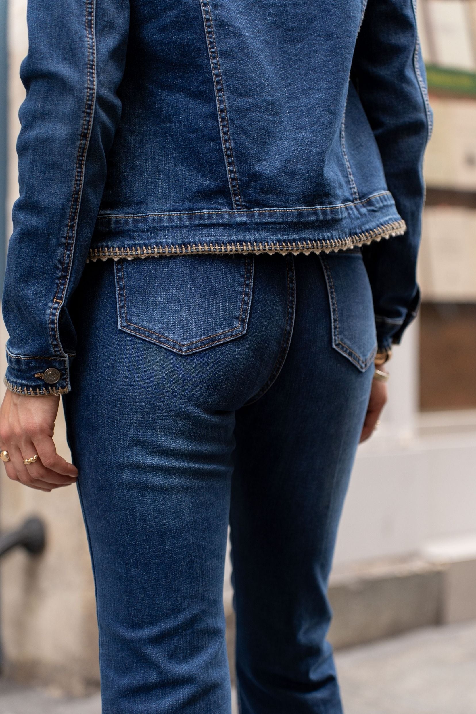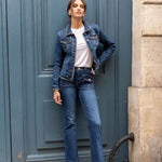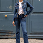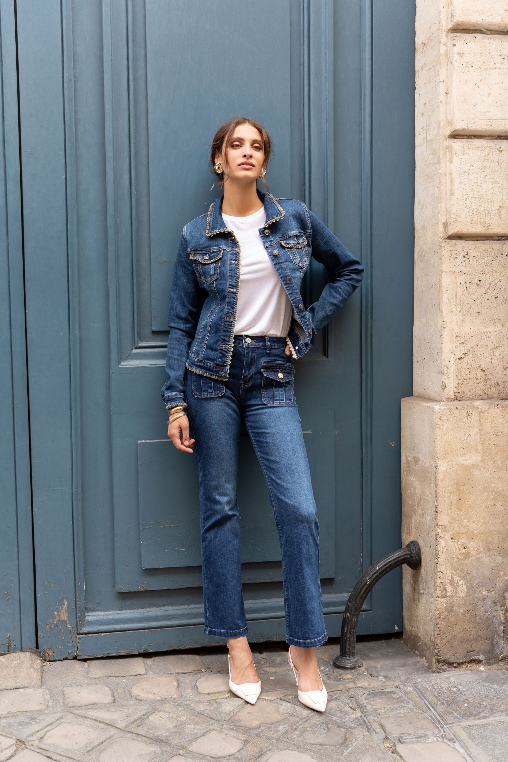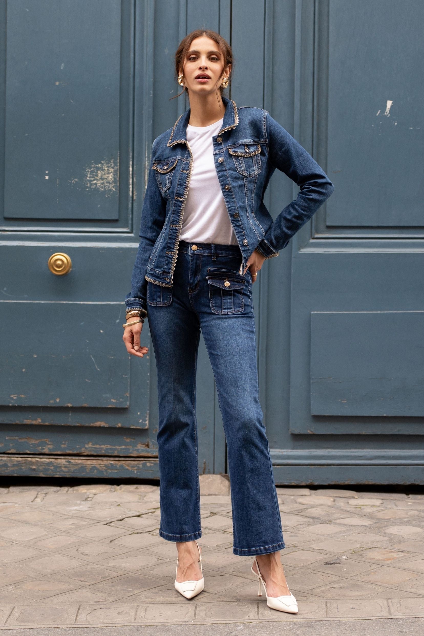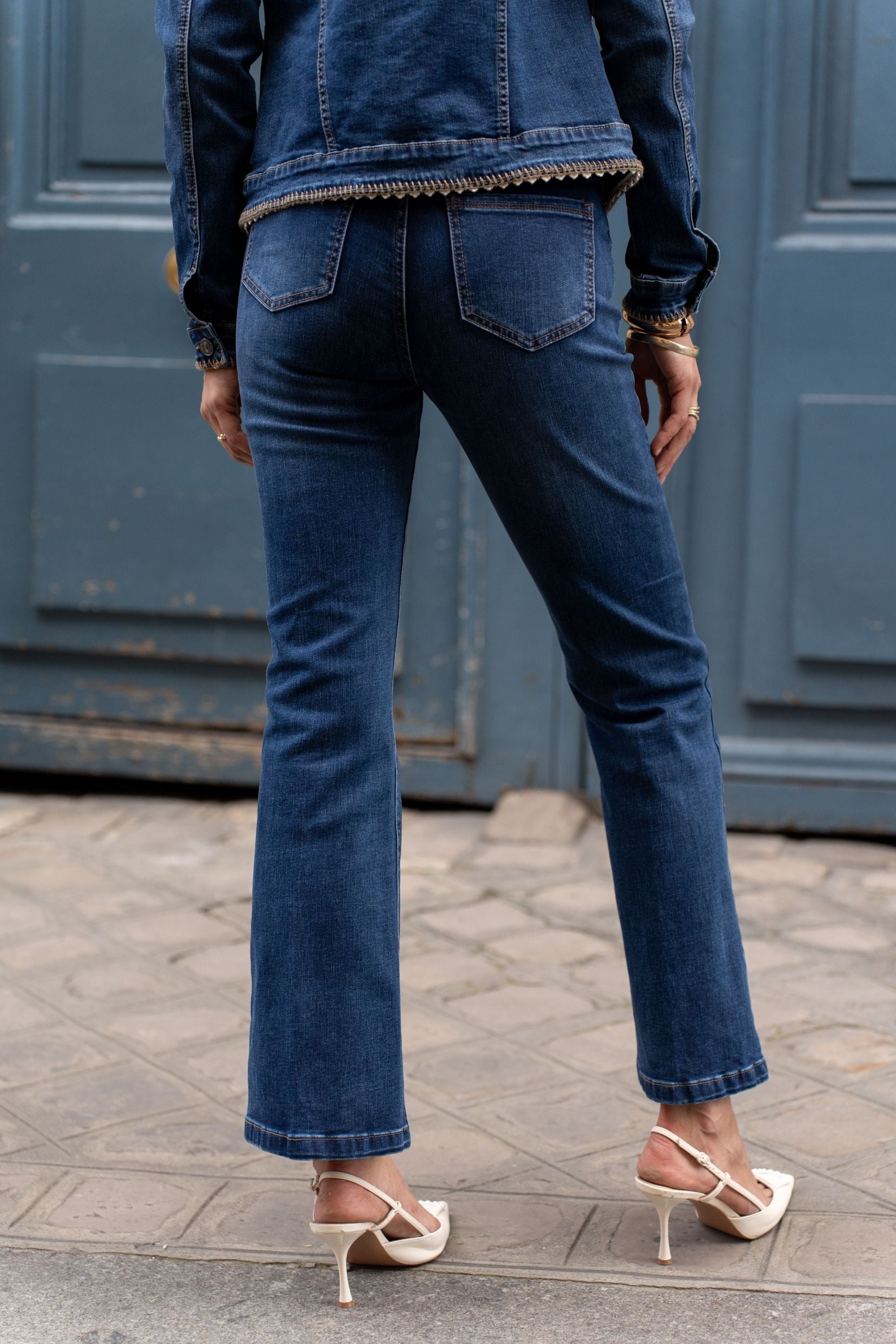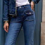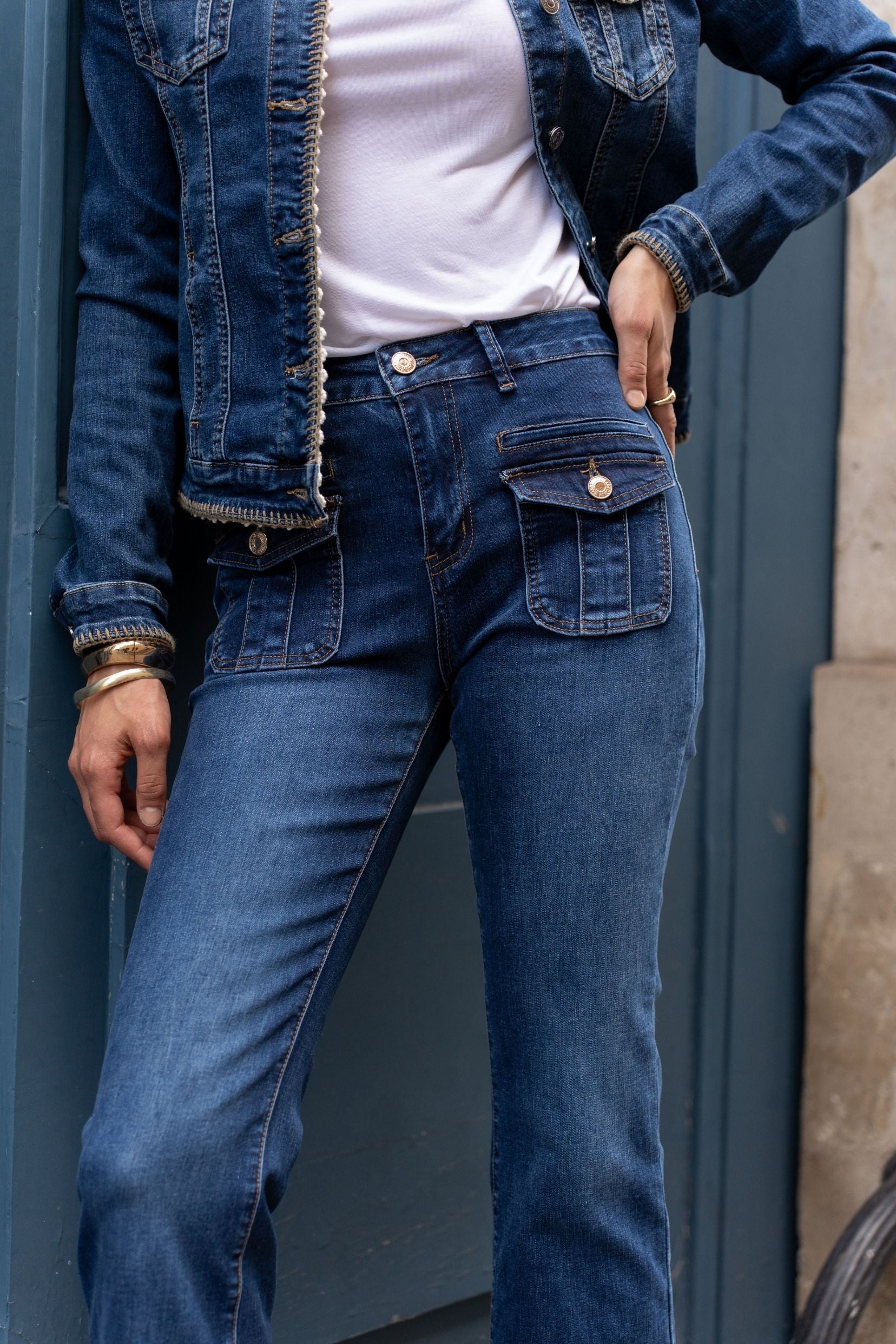 Jean flare avec passants ceinture et 2 poches à rabats, les poches elle-même surmontées de poches passepoilées.