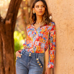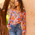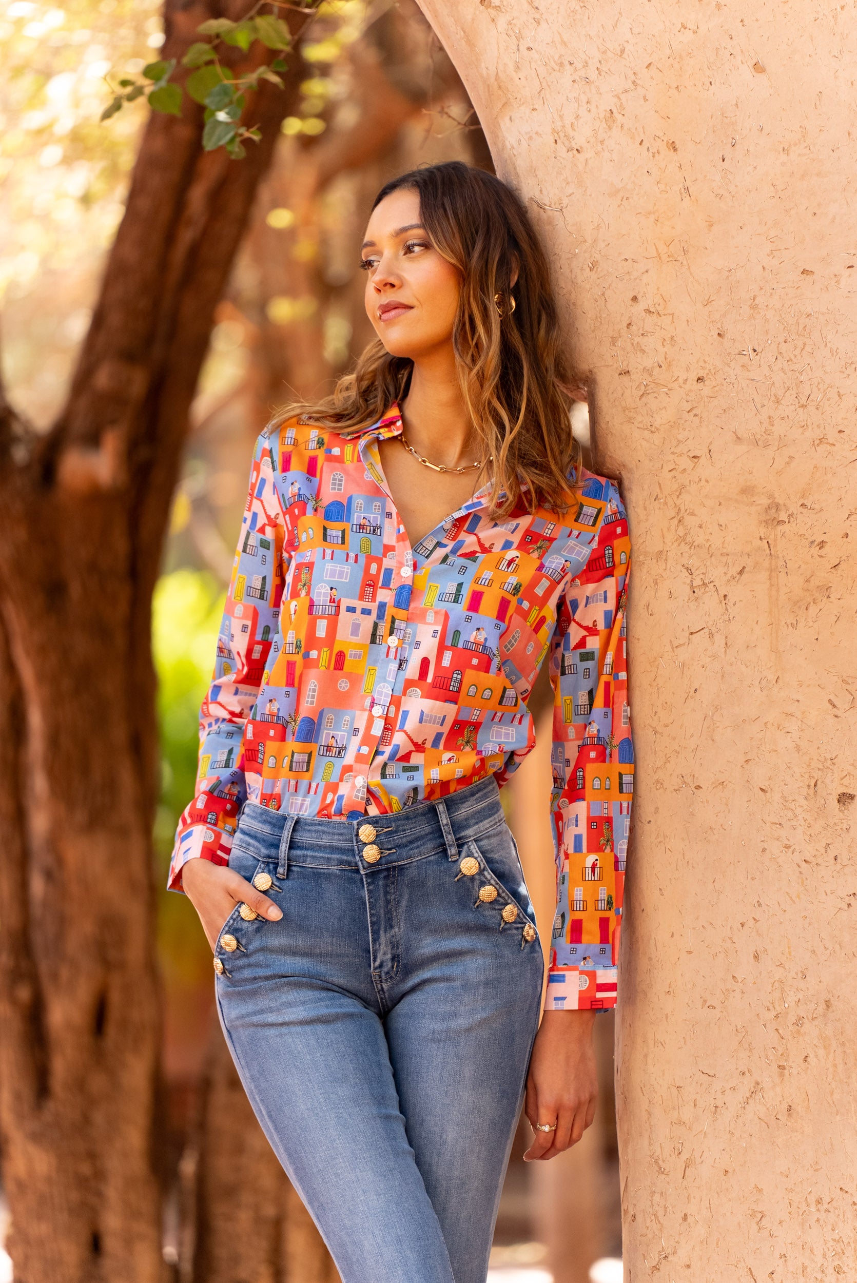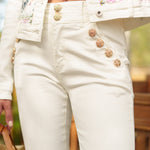Jean avec des boutons dorés sur les poches avant, offrant une coupe inspirée des années 70 pour un look original et chic.