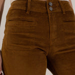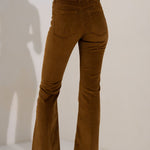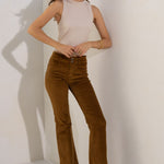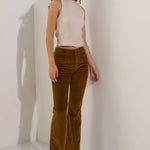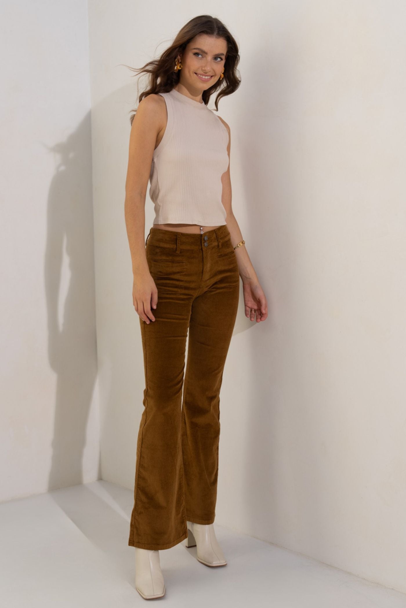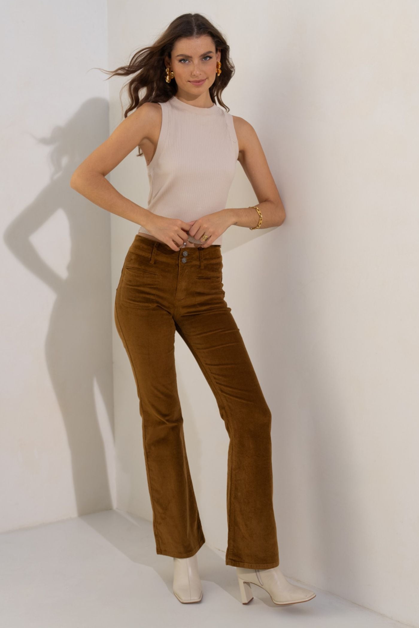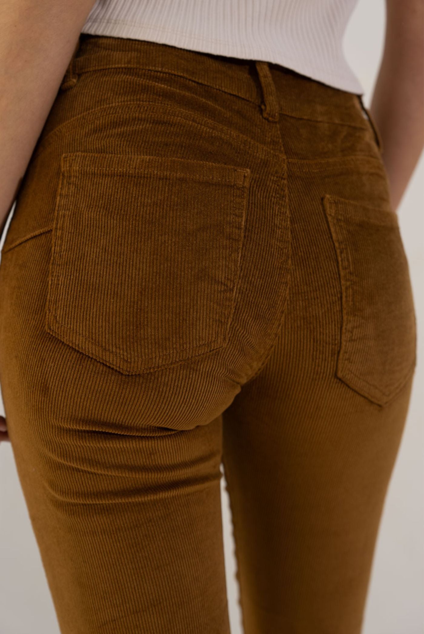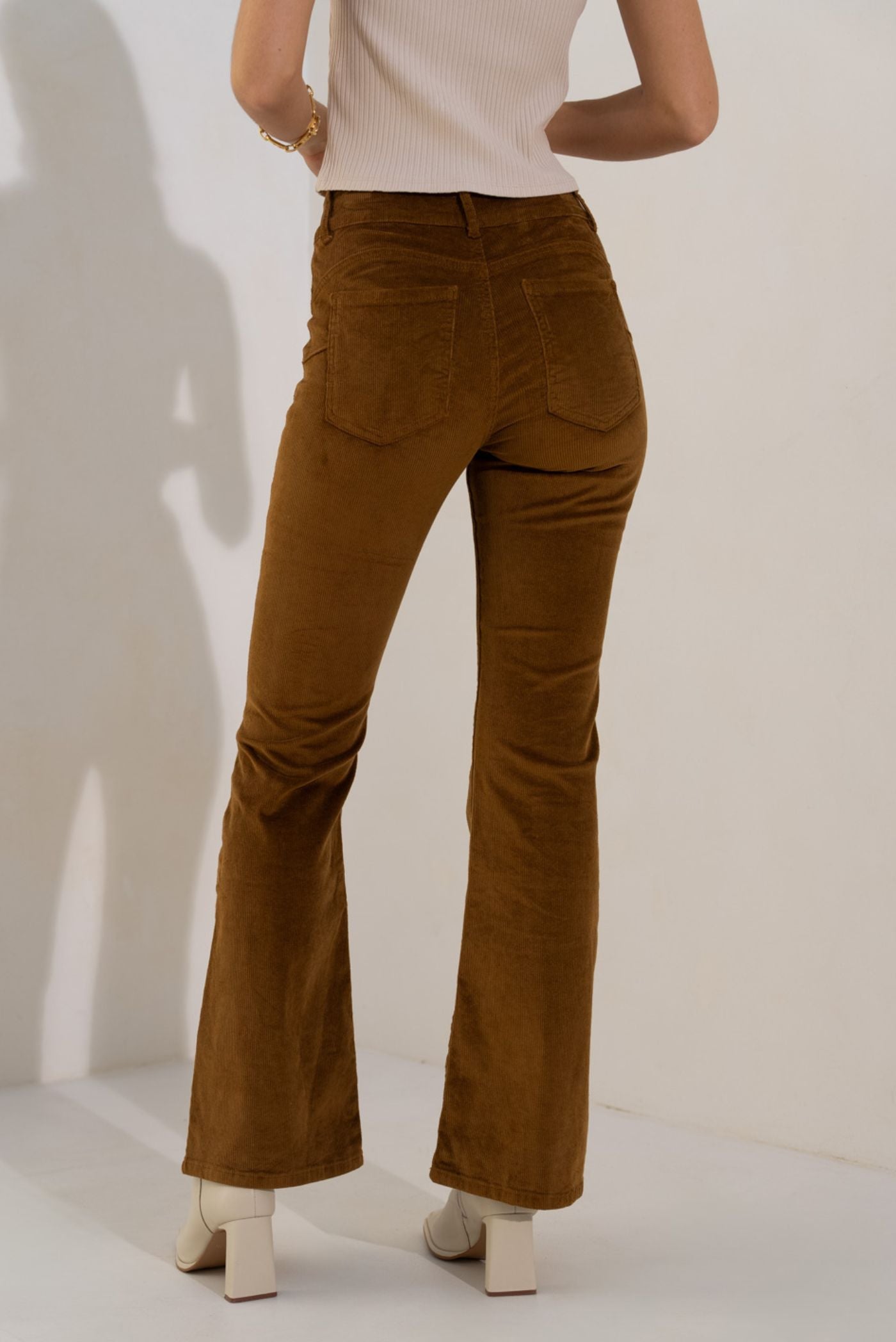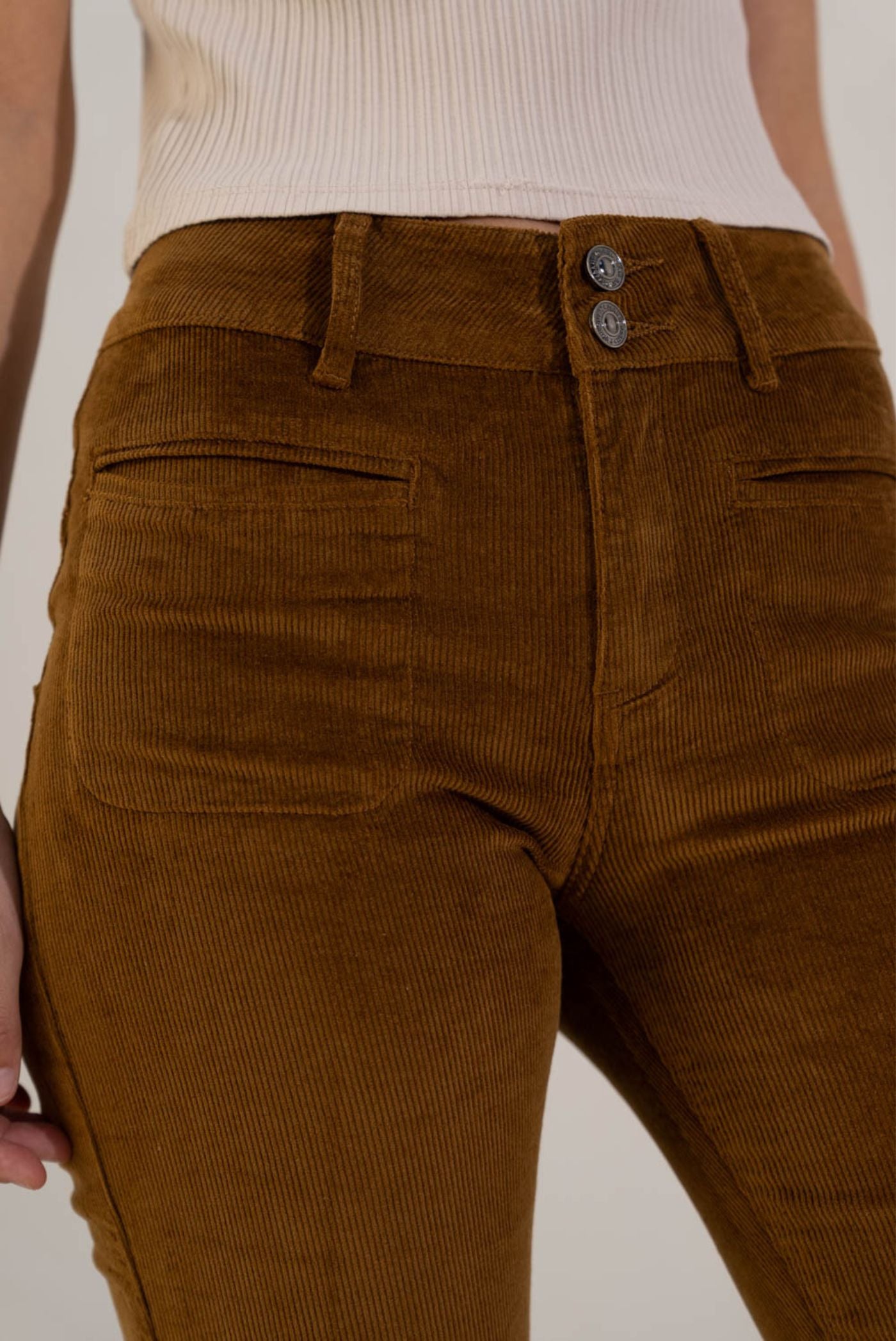 • Design: Pantalon couleur caramel en velours coton, coupe flare en rappel aux années 60', poches avant passepoilées.