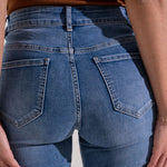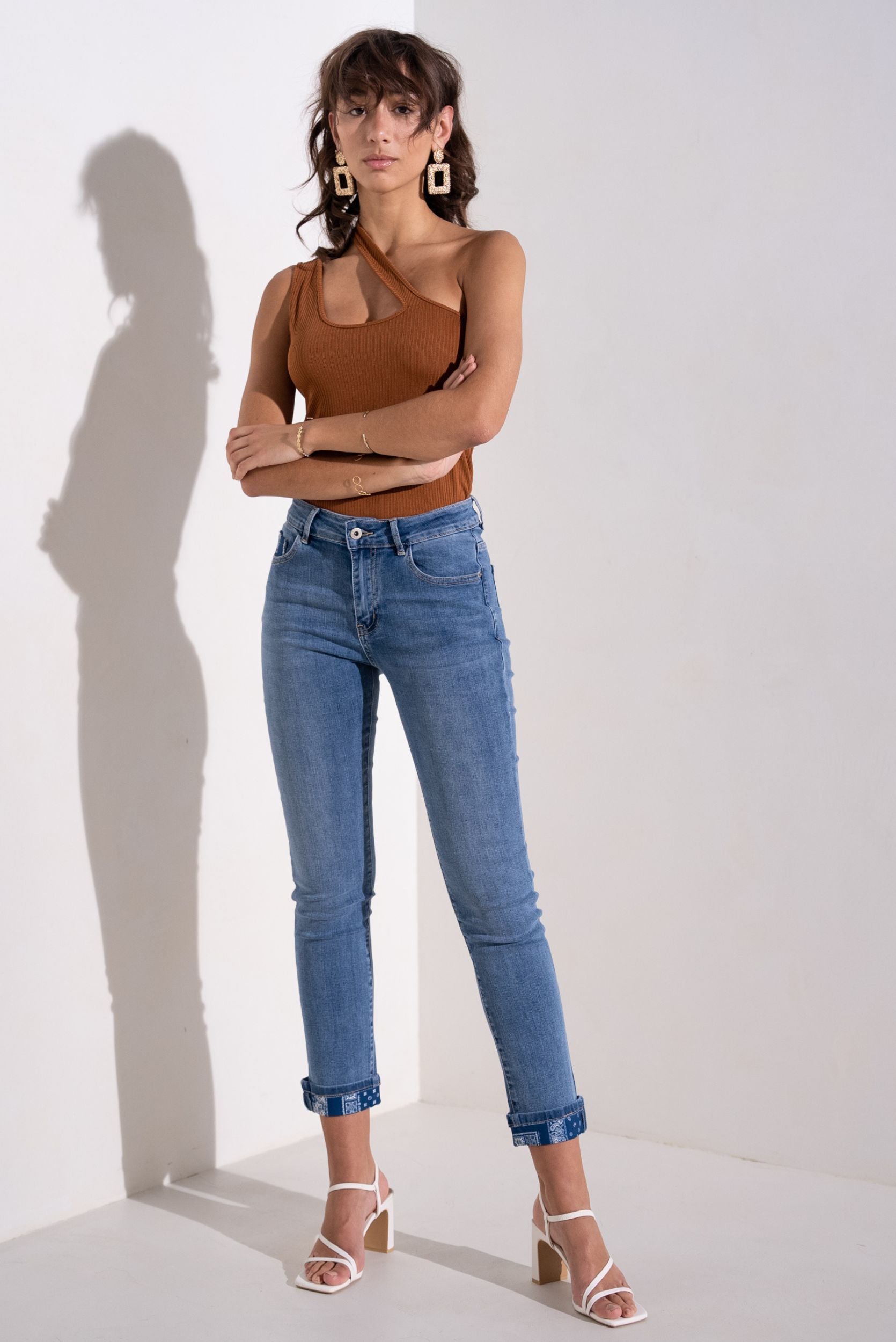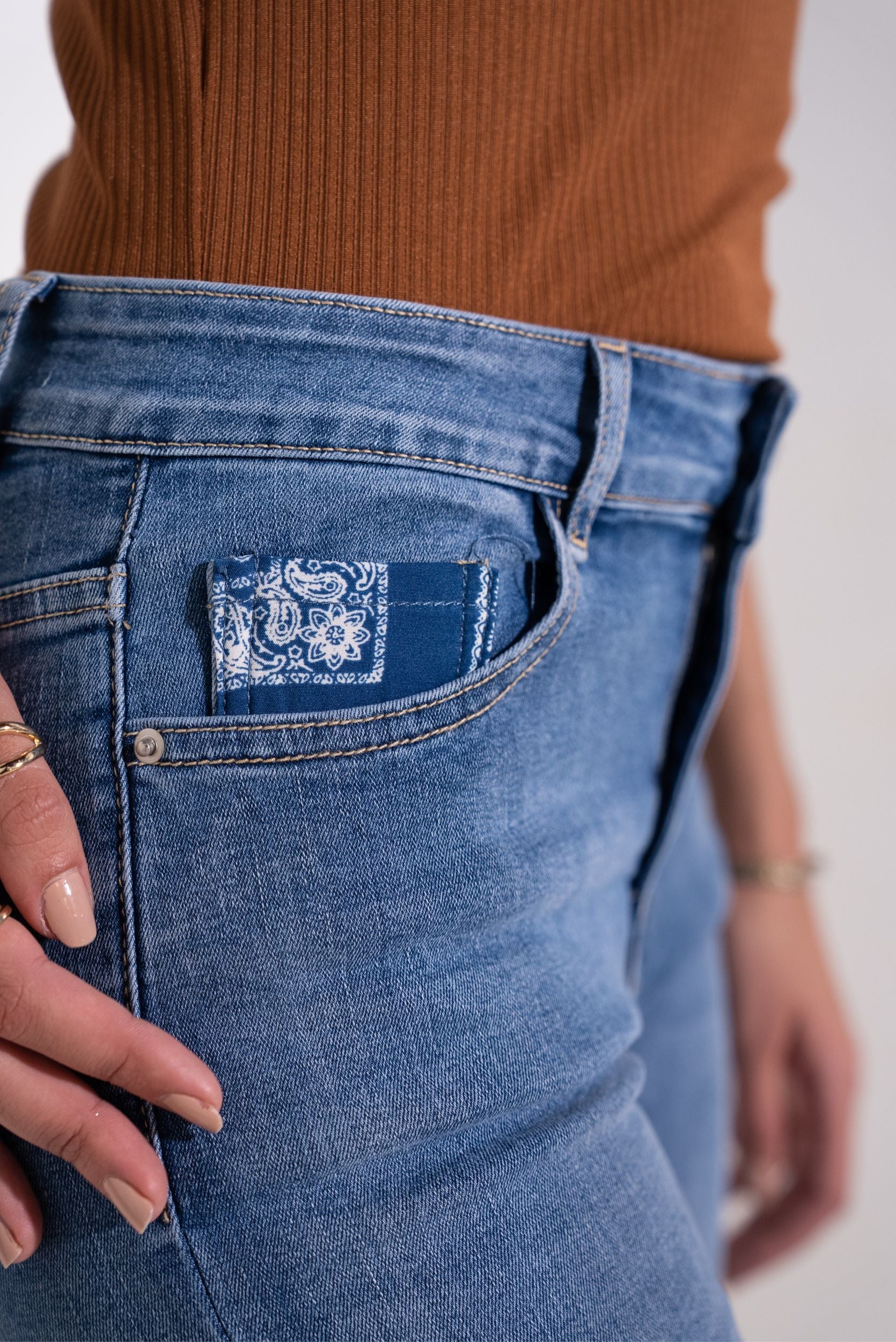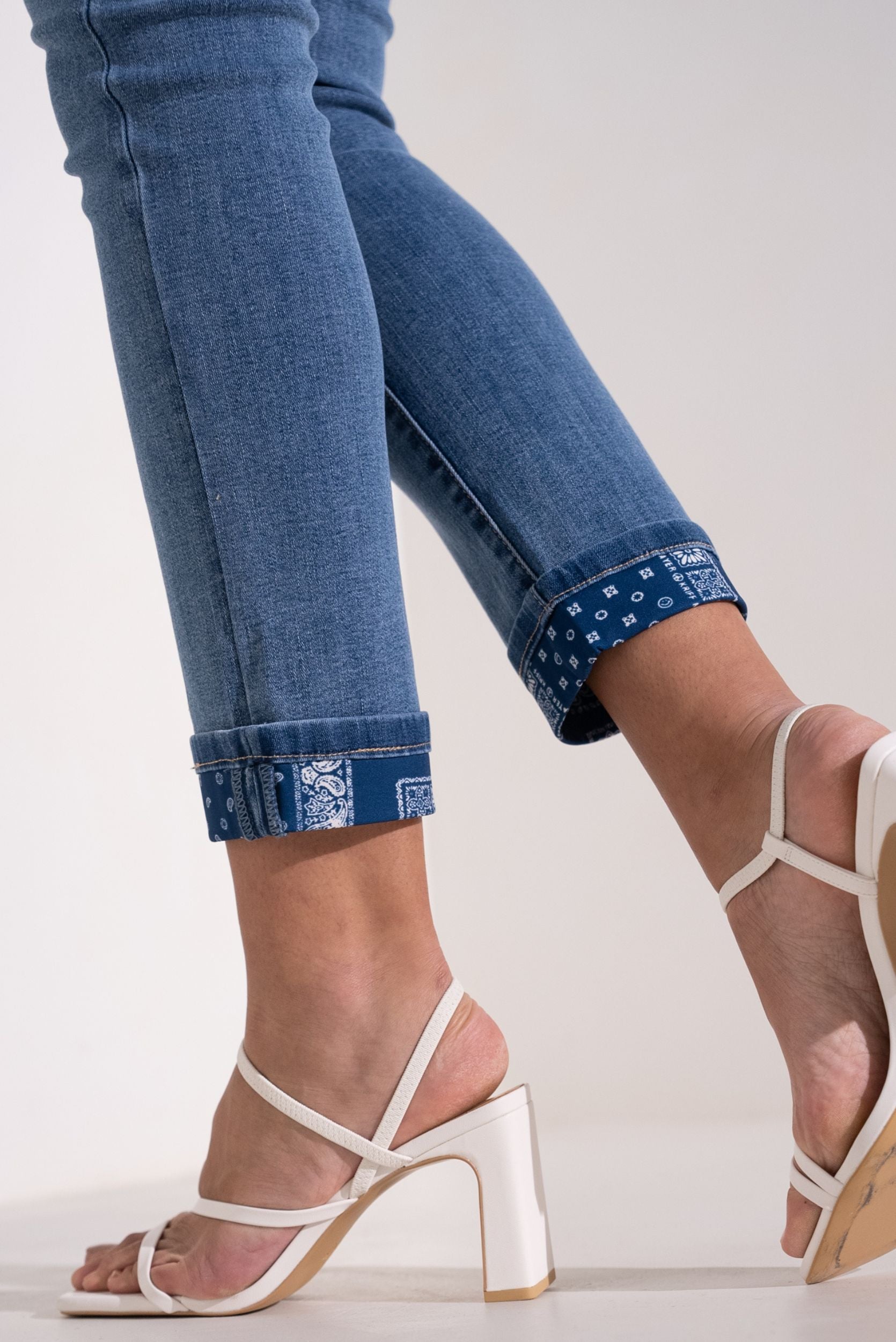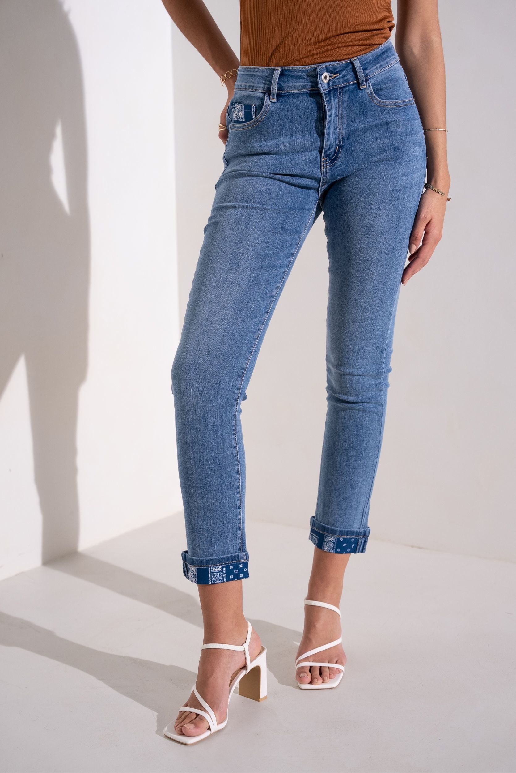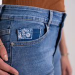 Jean droit Juliette. Pantalon revers imprimé cachemire bleu. Passant ceinture. Poches jeans.