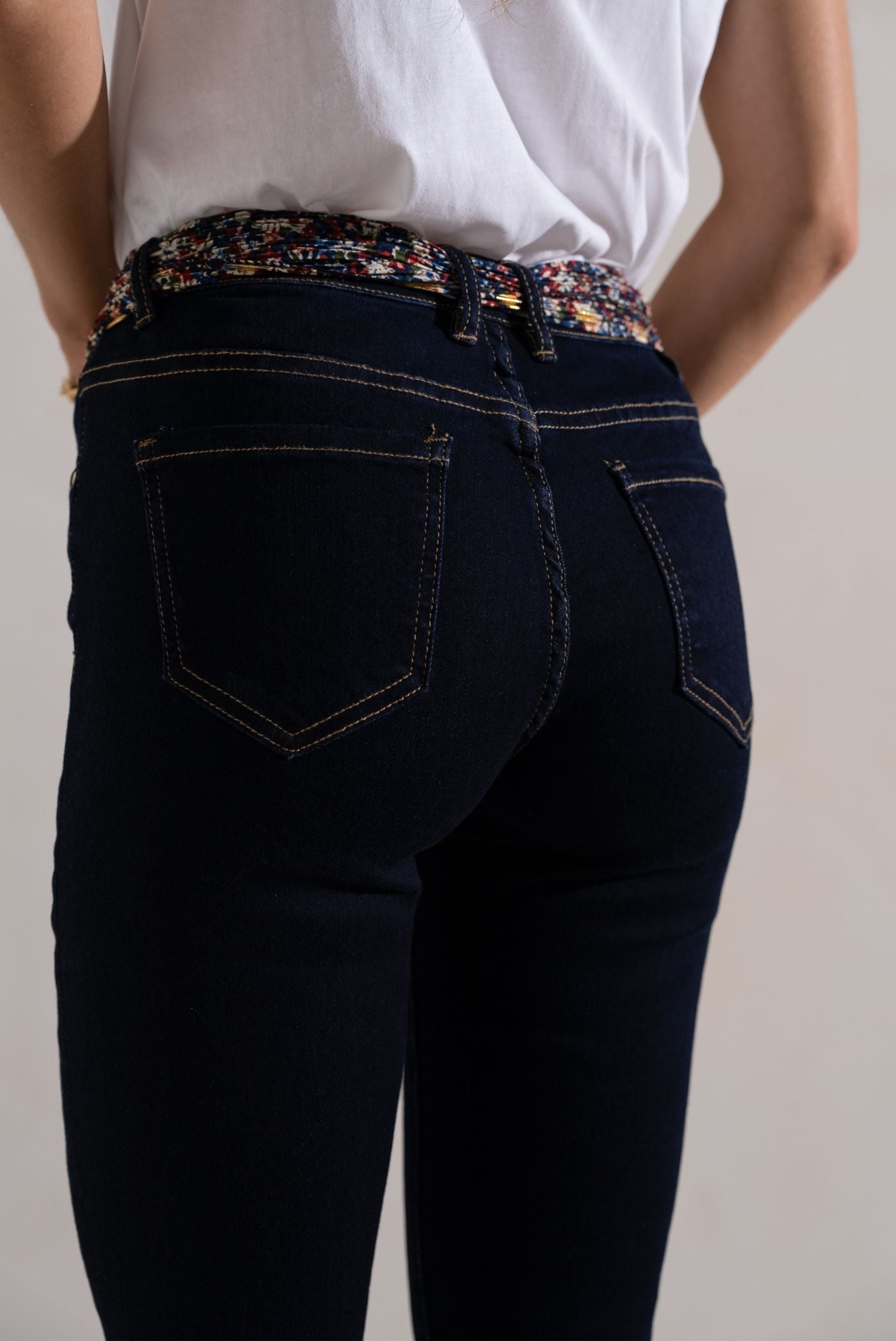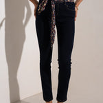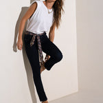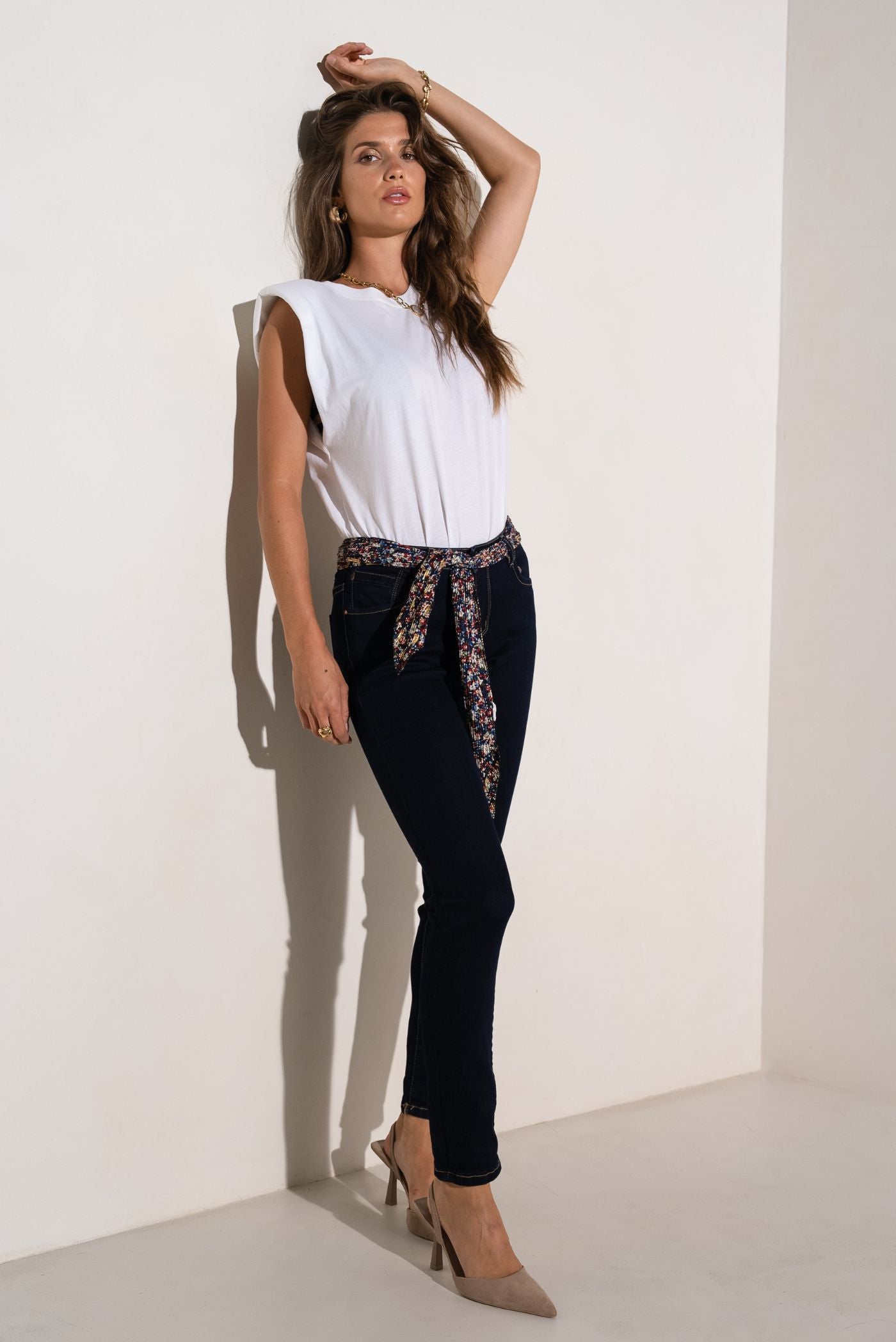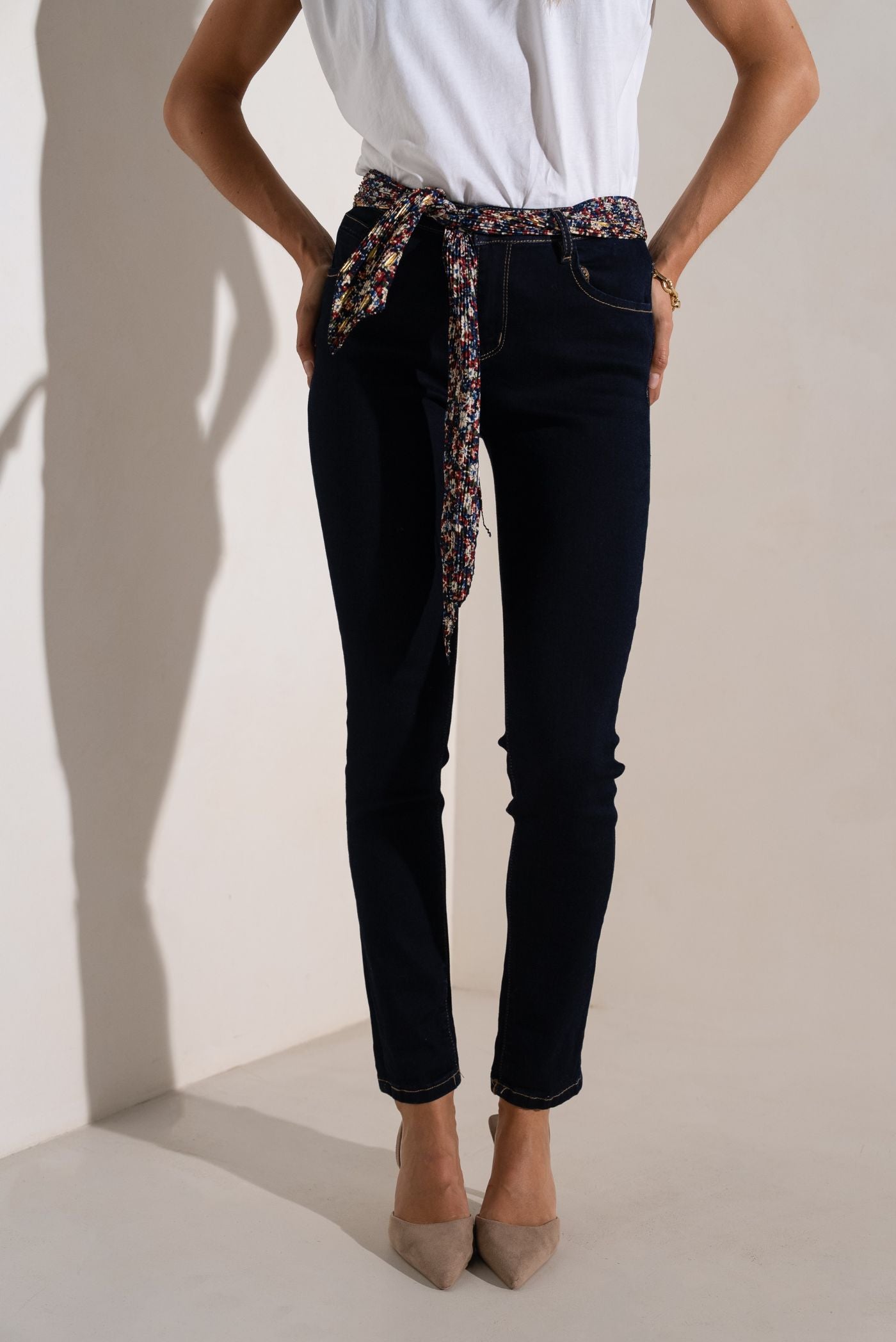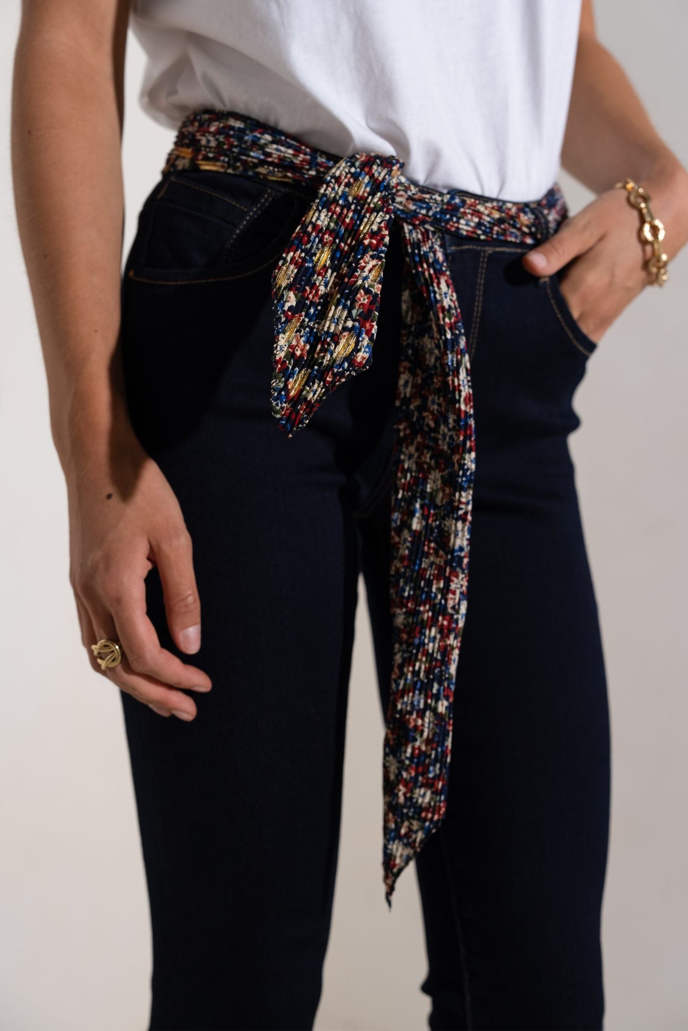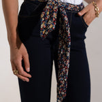 Pantalon toile repreve recycle polyester en denim brut, accompagné de son foulard-ceinture en tant qu'accessoire intemporel.