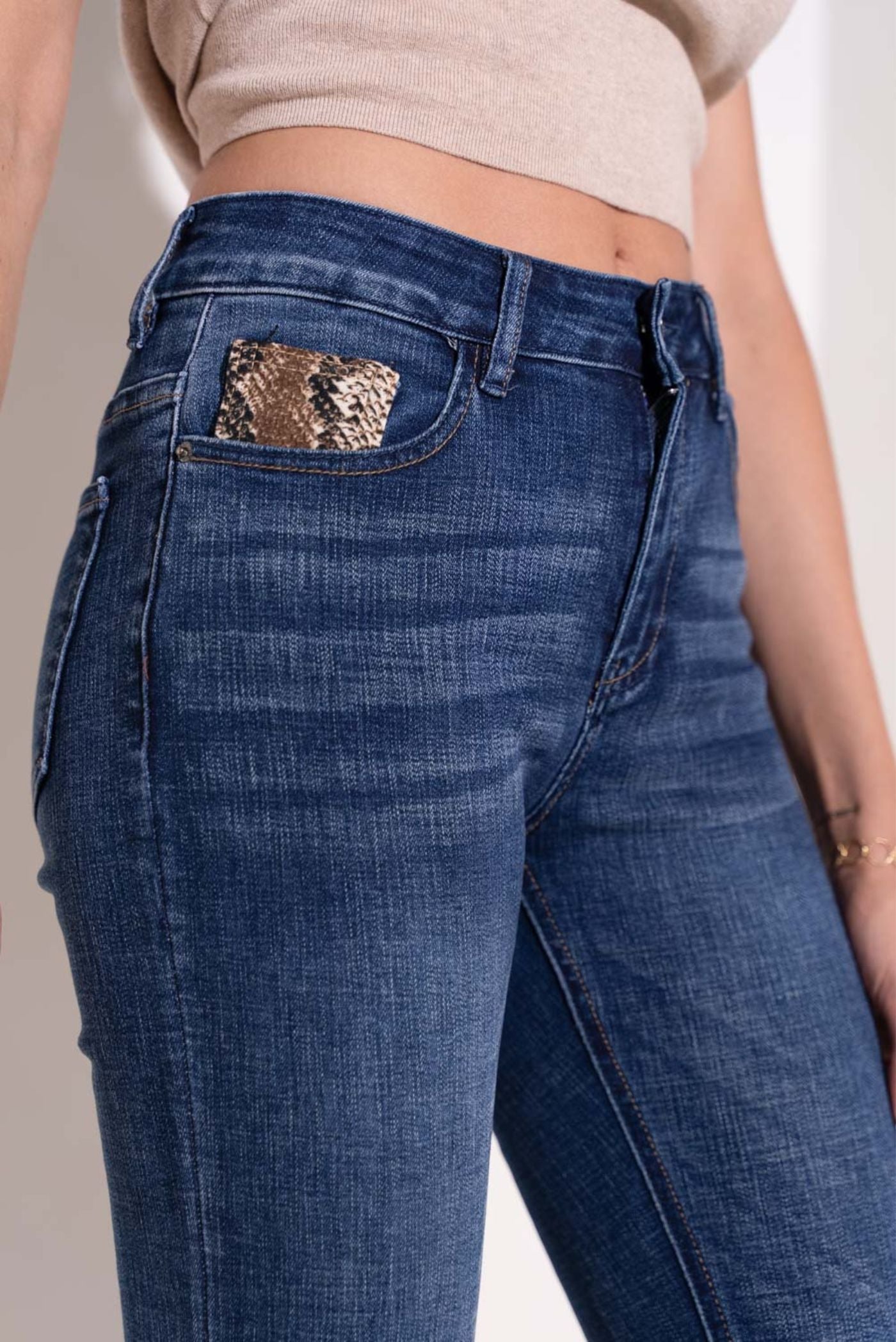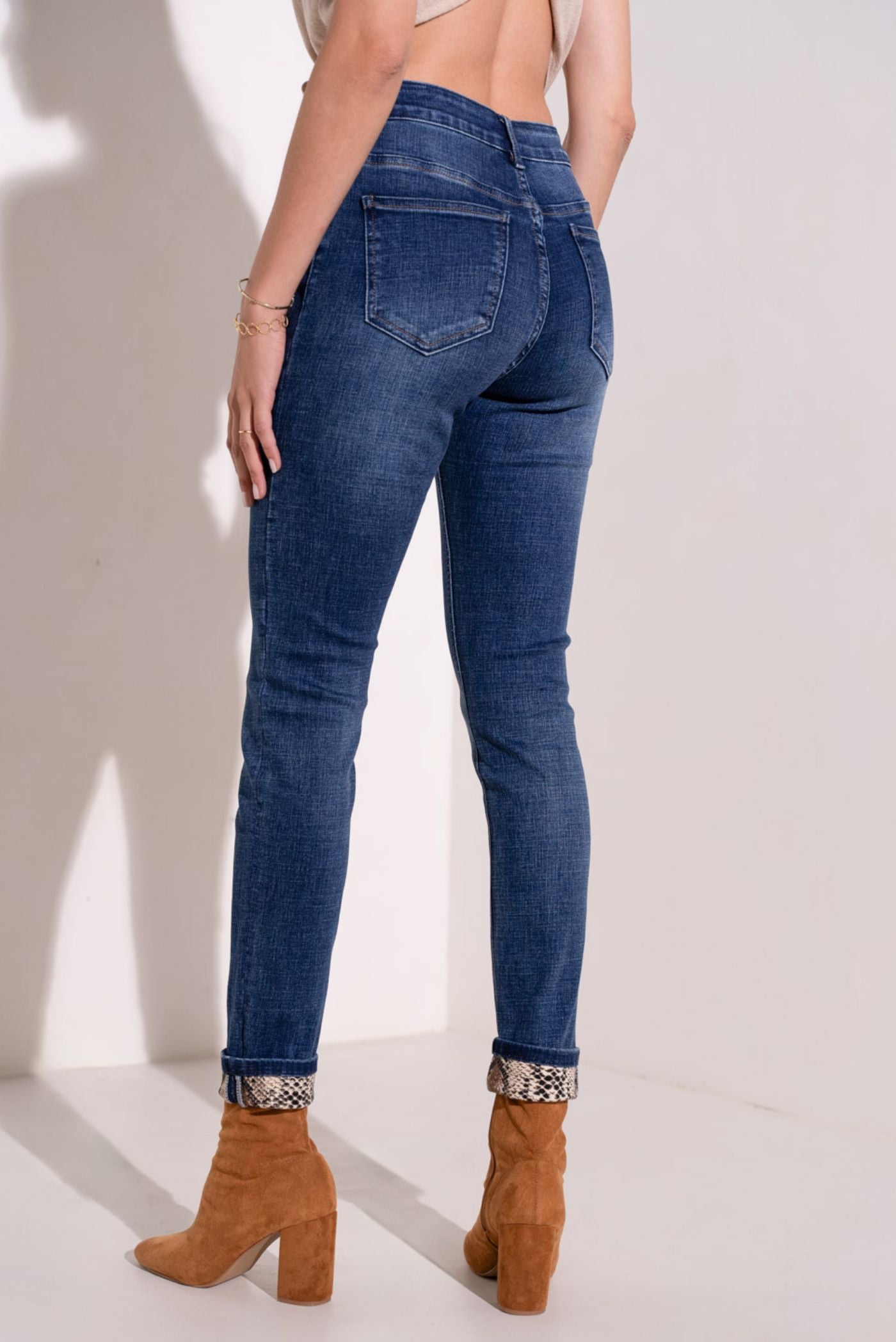 - Design: Rehaussé de revers à l'imprimé snake, ainsi qu'une 5ème poche assortie. Confectionné en toile denim bleu, ce pantalon présente un subtil détail serpent qui ajoute une touche distinctive.