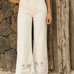 Détails : Denim bleu clair. Broderies palmier et soleil au bas de jambe, esprit carte postale. Ceinture incluse, elle aussi brodée, qui vient signer la pièce avec une touche artisanale. Poches classiques, finitions soignées.