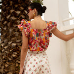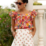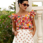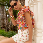 Short imprimé taille haute avec boutons fleurs en or à l'avant et une ouverture sur le côté par un zip.
