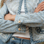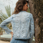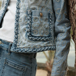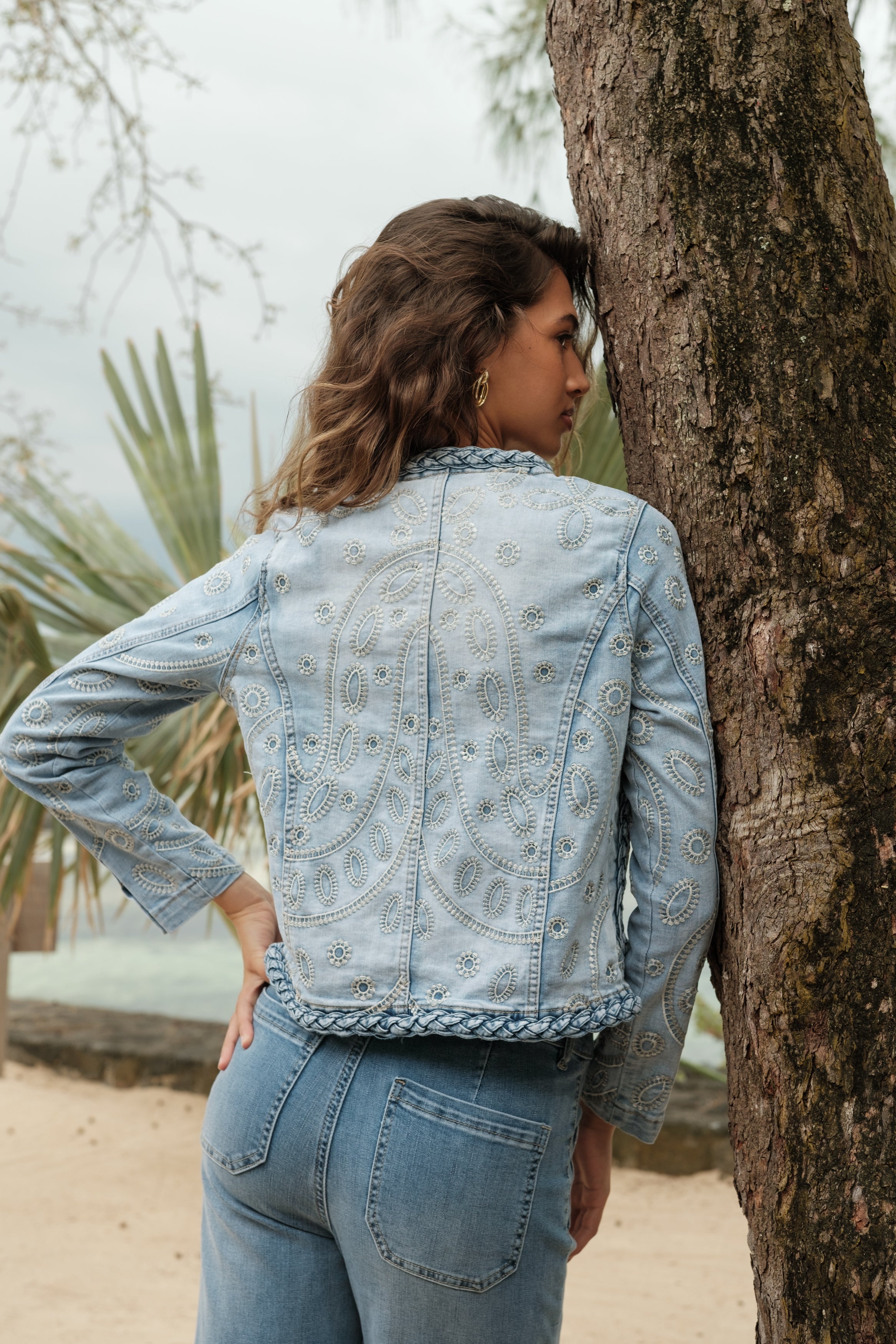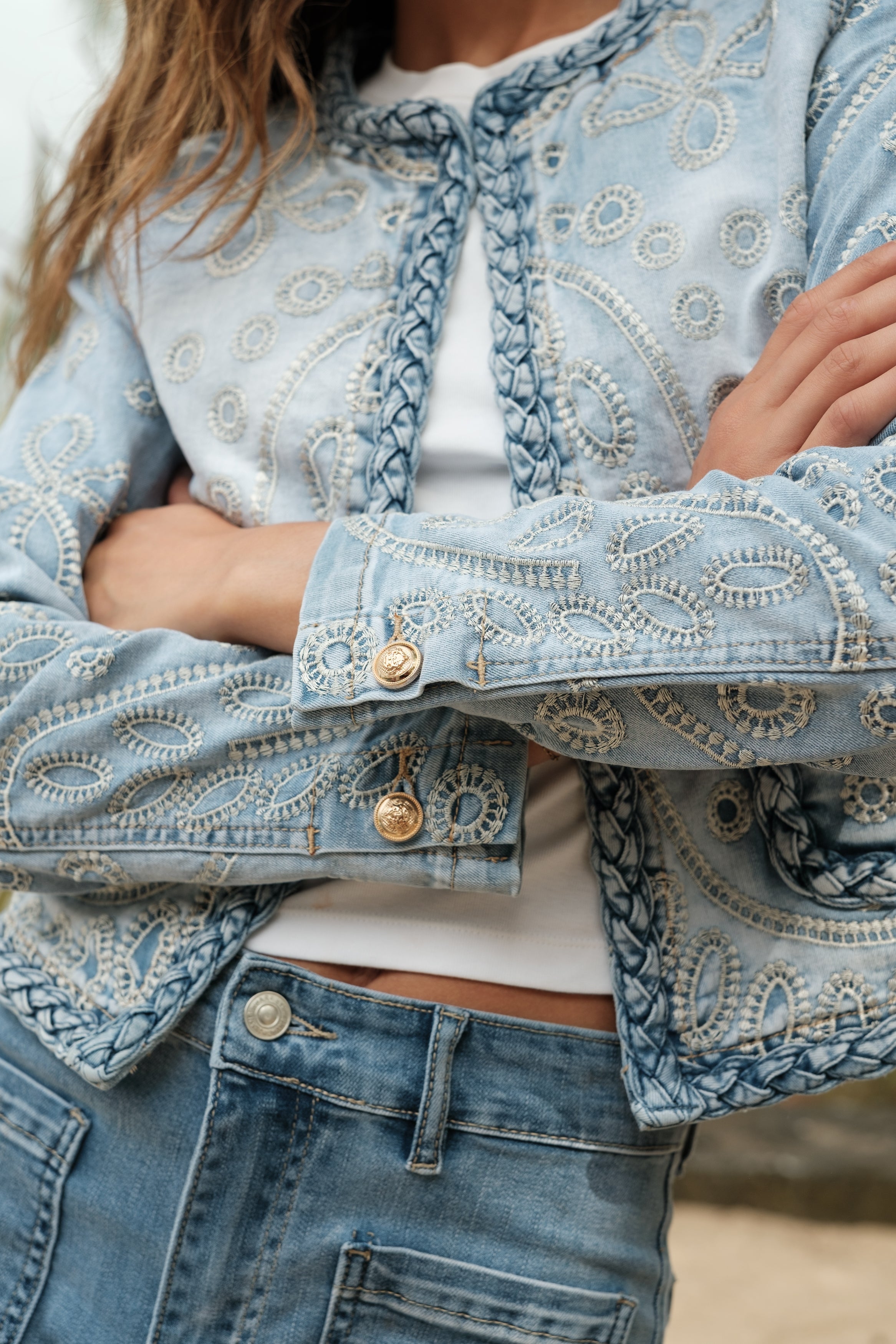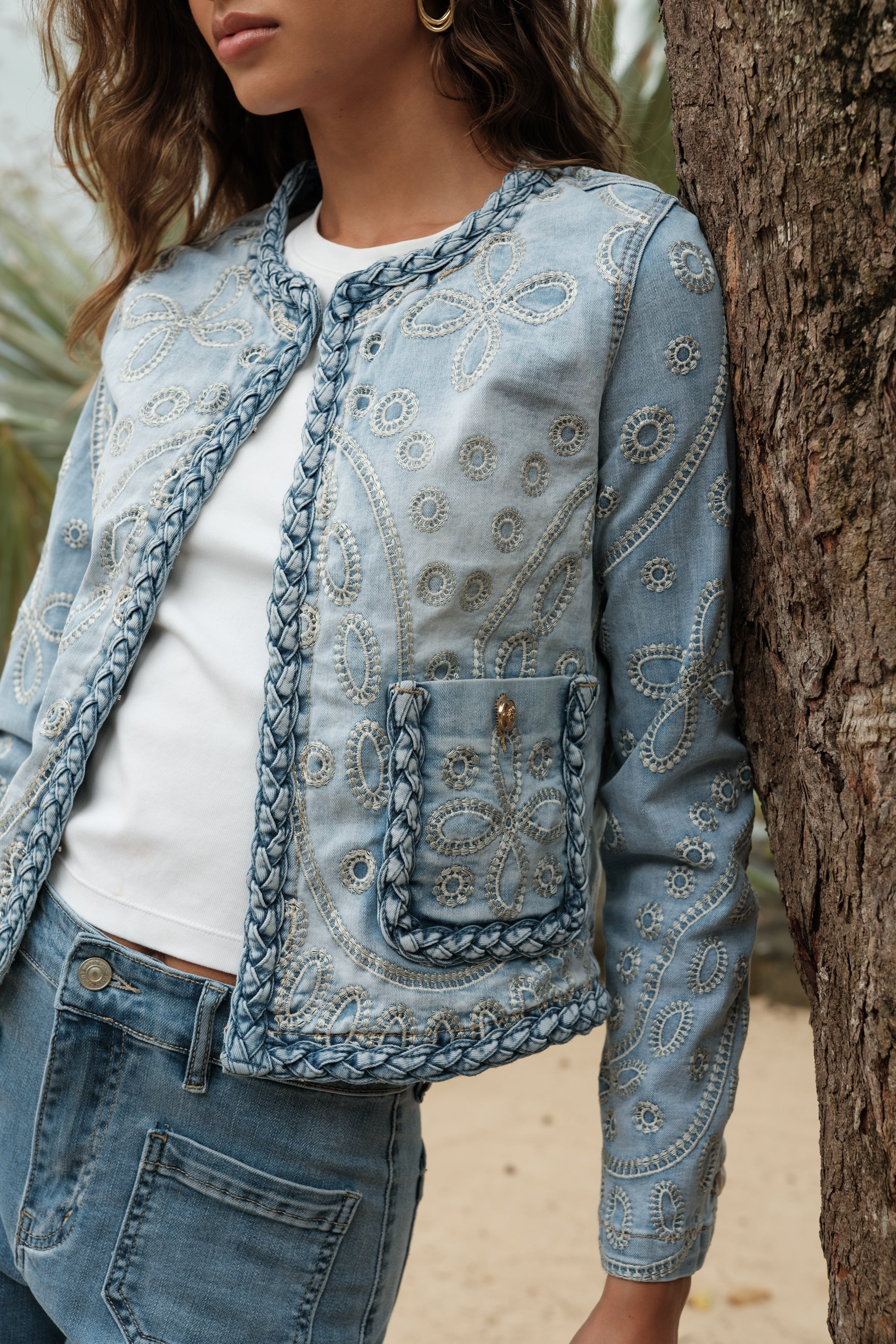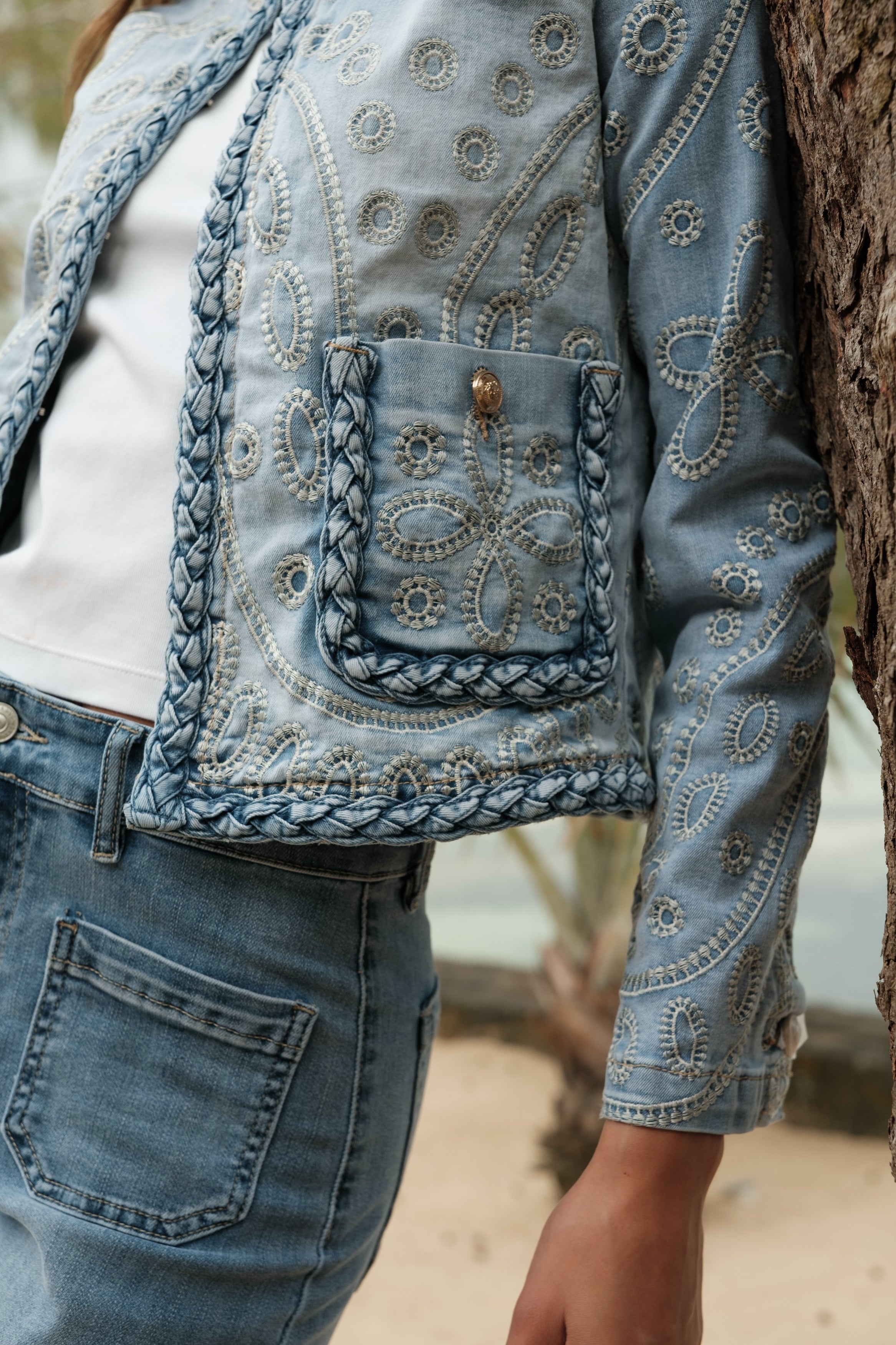 Détails : Broderies all over aux motifs délicats, inspirées d’un savoir-faire artisanal. Finitions en tresse le long des bordures et des poches, rehaussées de boutons dorés lumineux.
