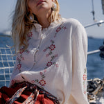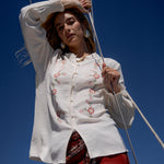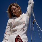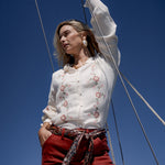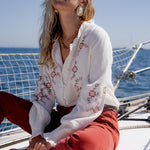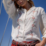 Détails : Broderies délicates façon fleurs champêtres sur le devant et les manches, petit col volanté, poignets froncés et boutonnage discret