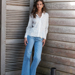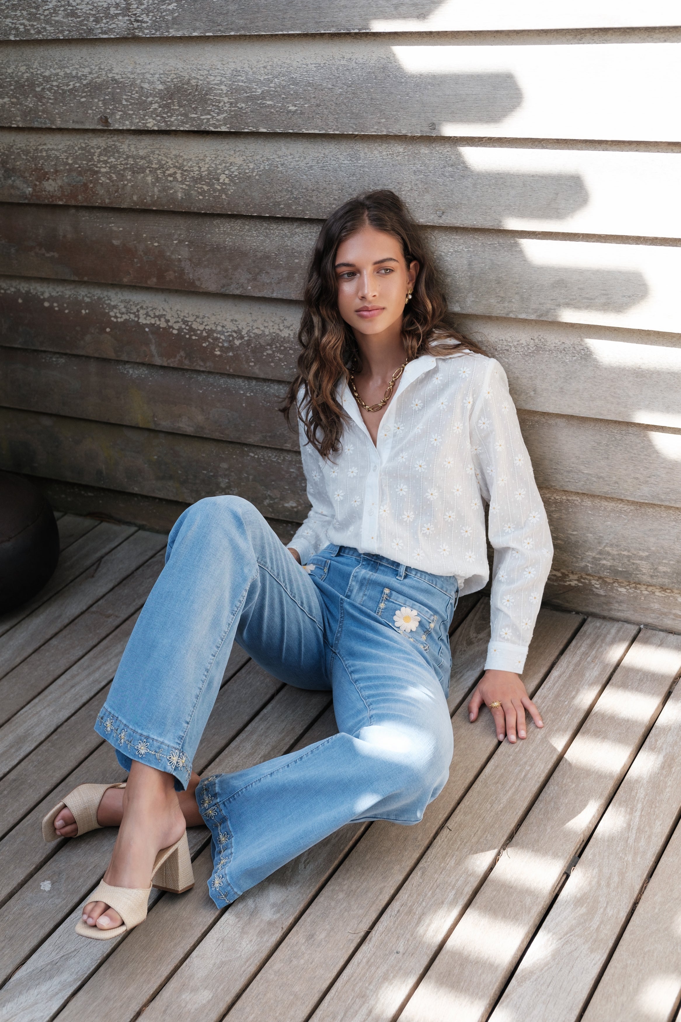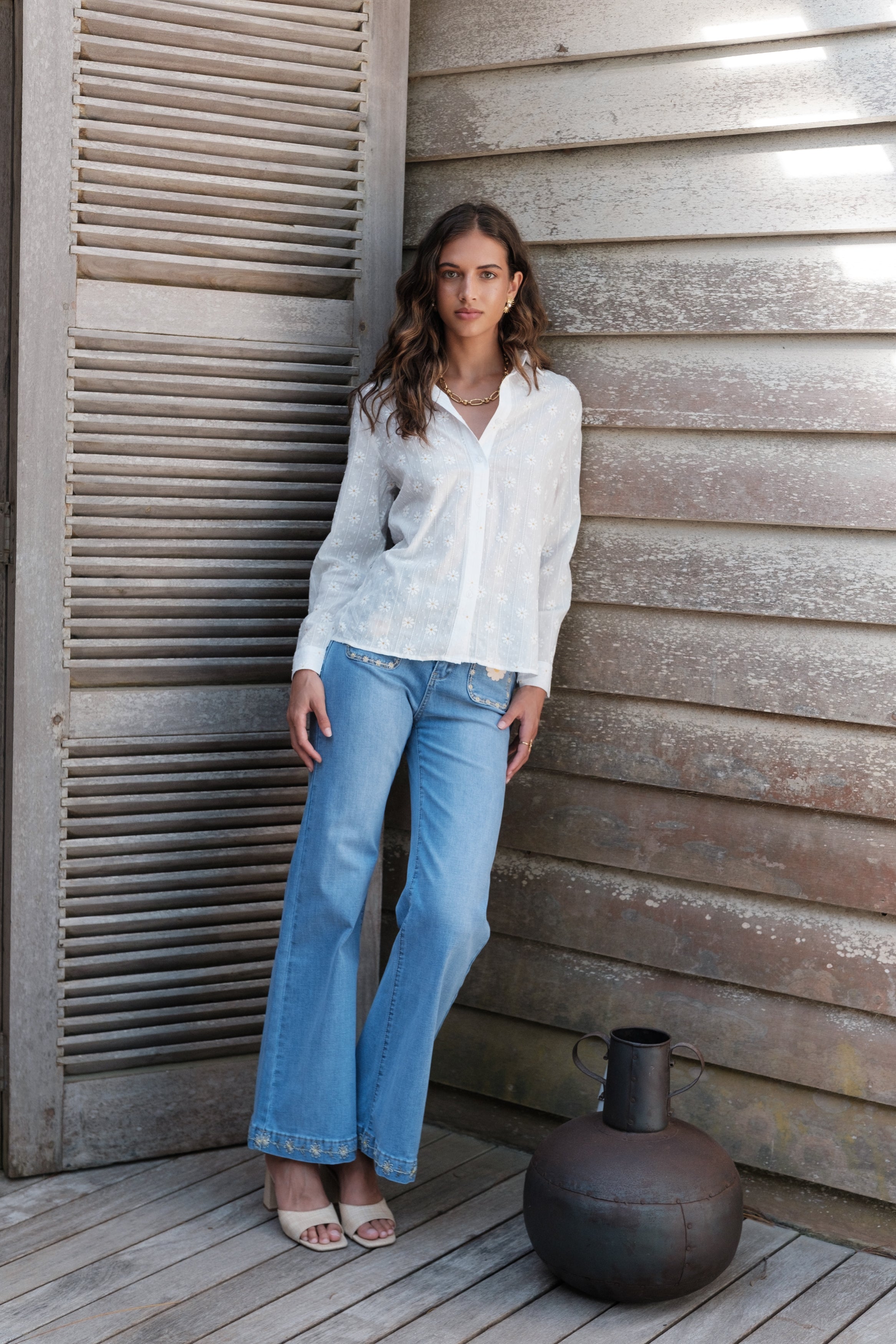 Bas de jambe subtilement brodé pour une finition raffinée et lumineuse.