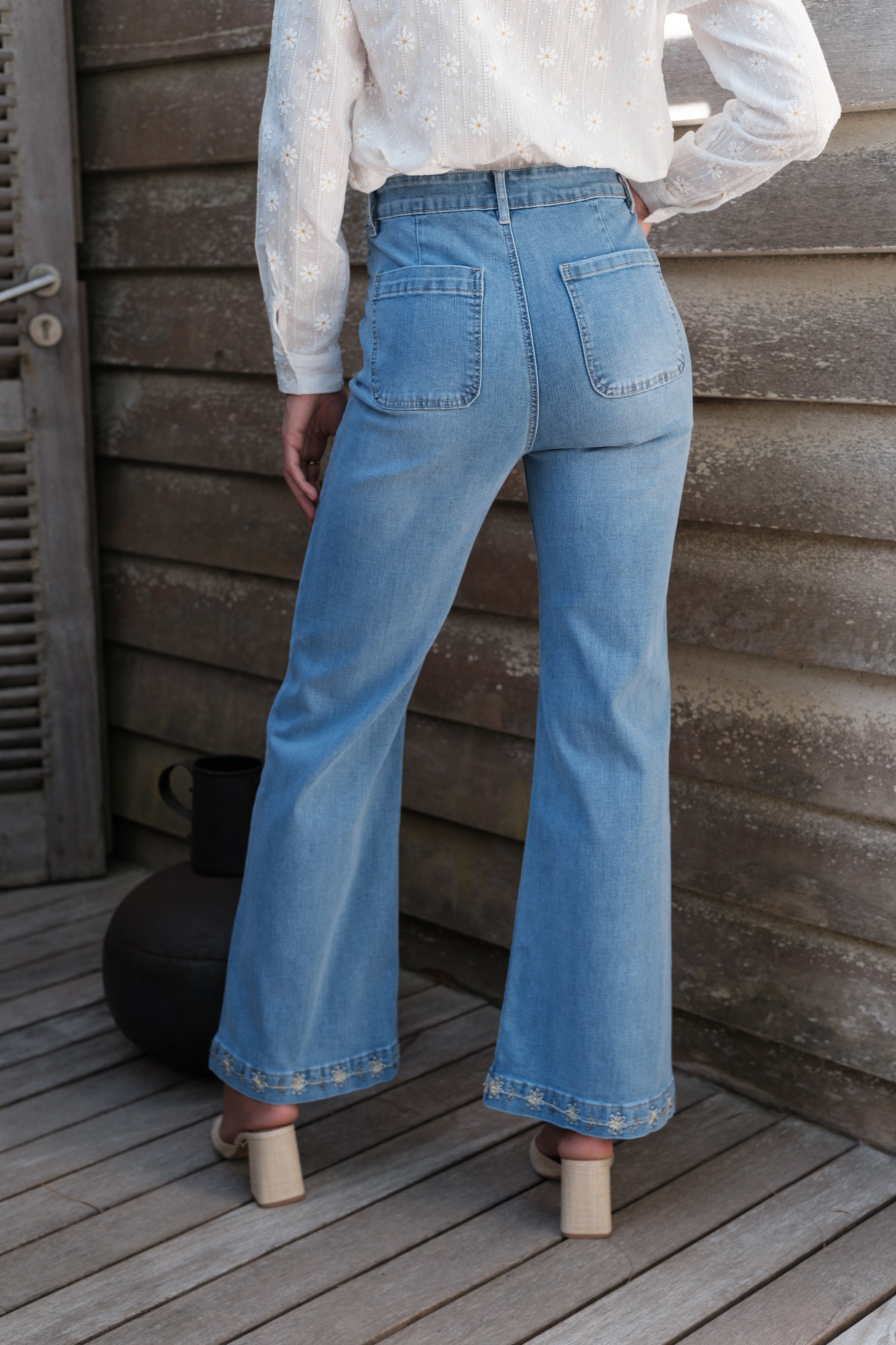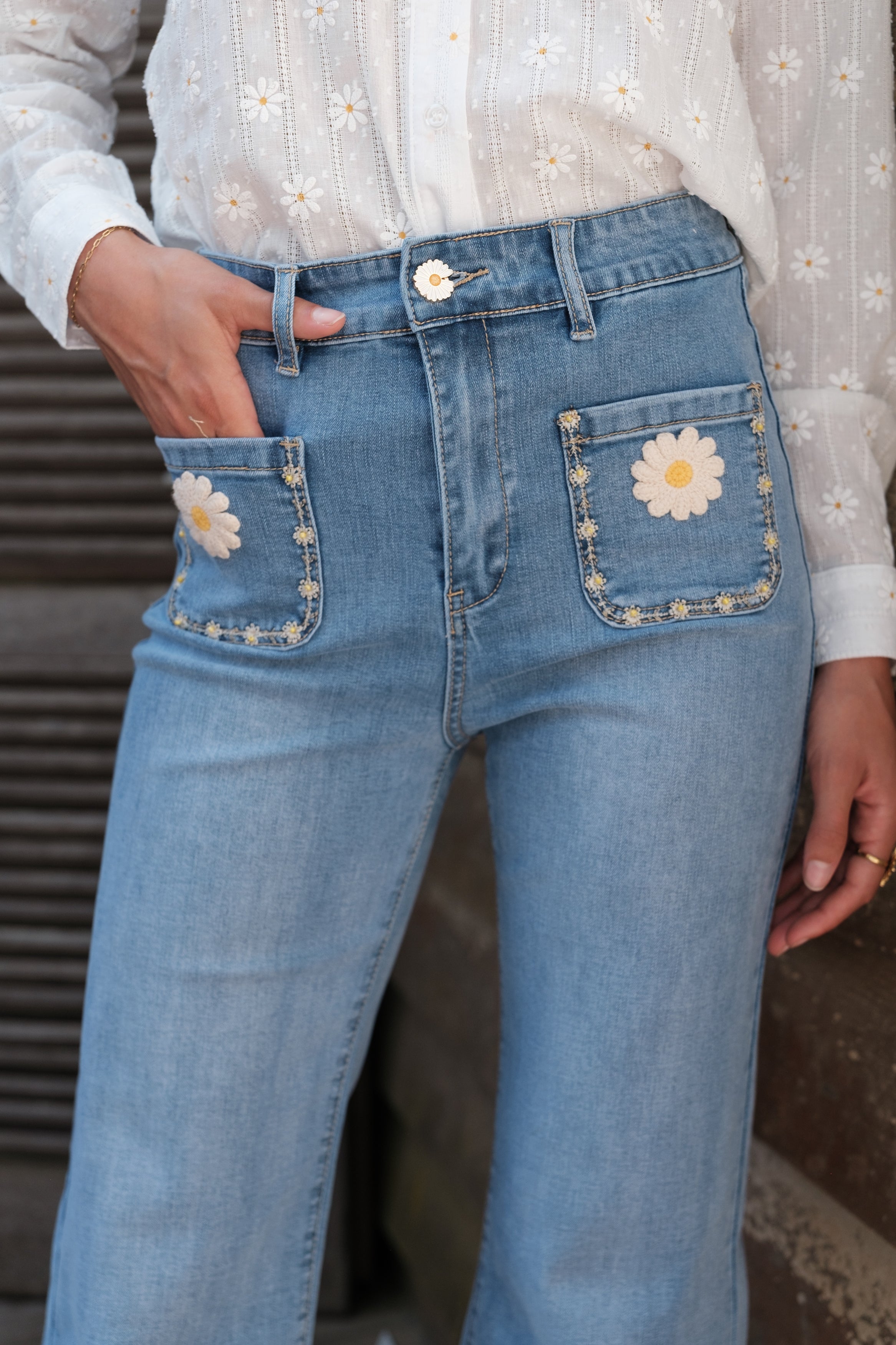 Détails : Denim bleu clair orné de poches plaquées brodées de marguerites à l’avant.