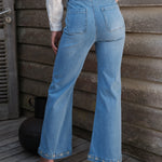 Coupe : Jean à la coupe droite légèrement évasée, taille haute.