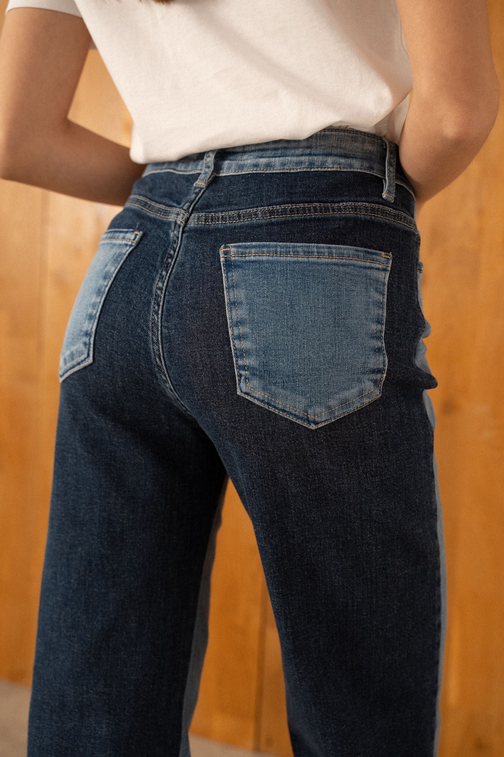 Détails : Denim clair à l’avant pour une allure lumineuse, contrasté par un denim plus foncé à l’arrière qui structure la silhouette. Les poches arrière sont réalisées en denim clair, rappelant la teinte de l’avant pour créer un joli jeu de contraste.