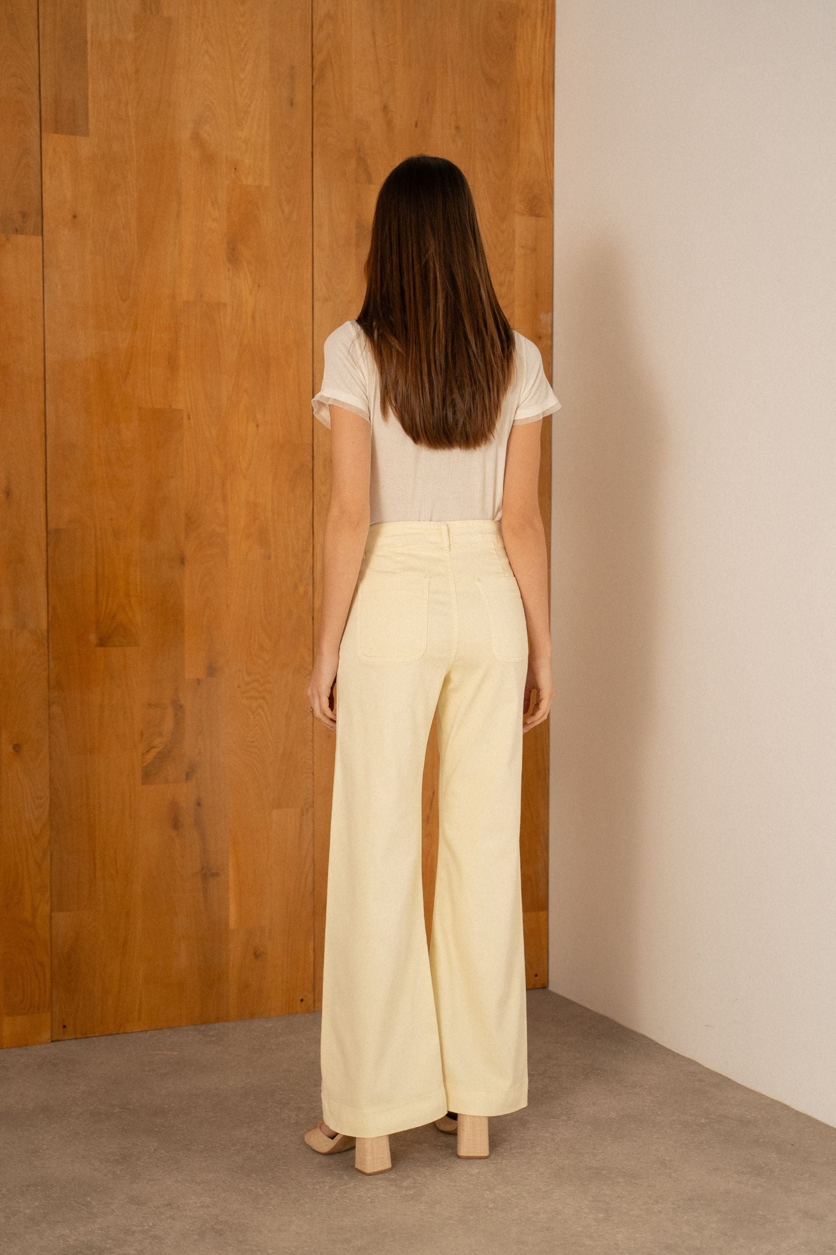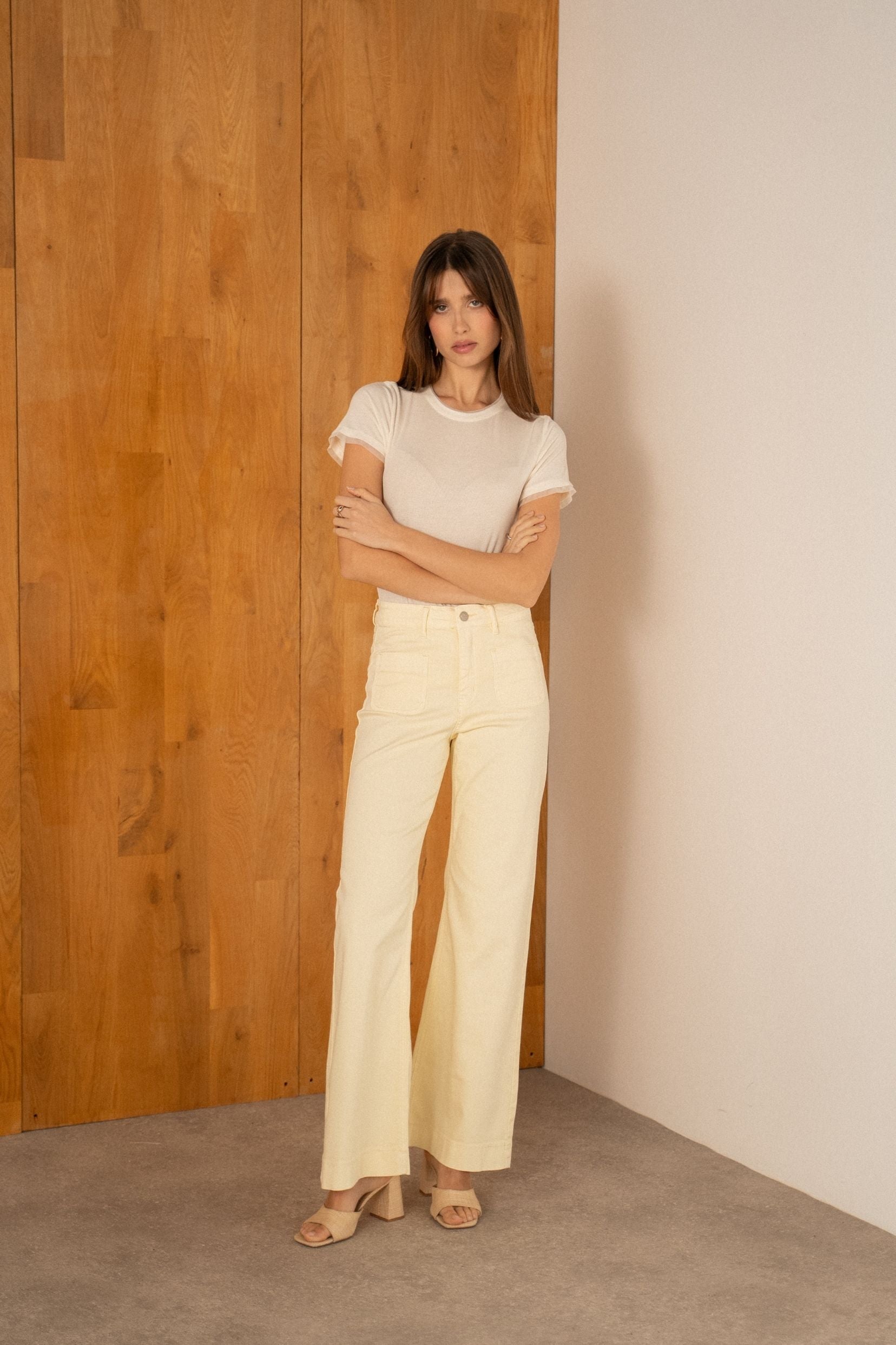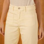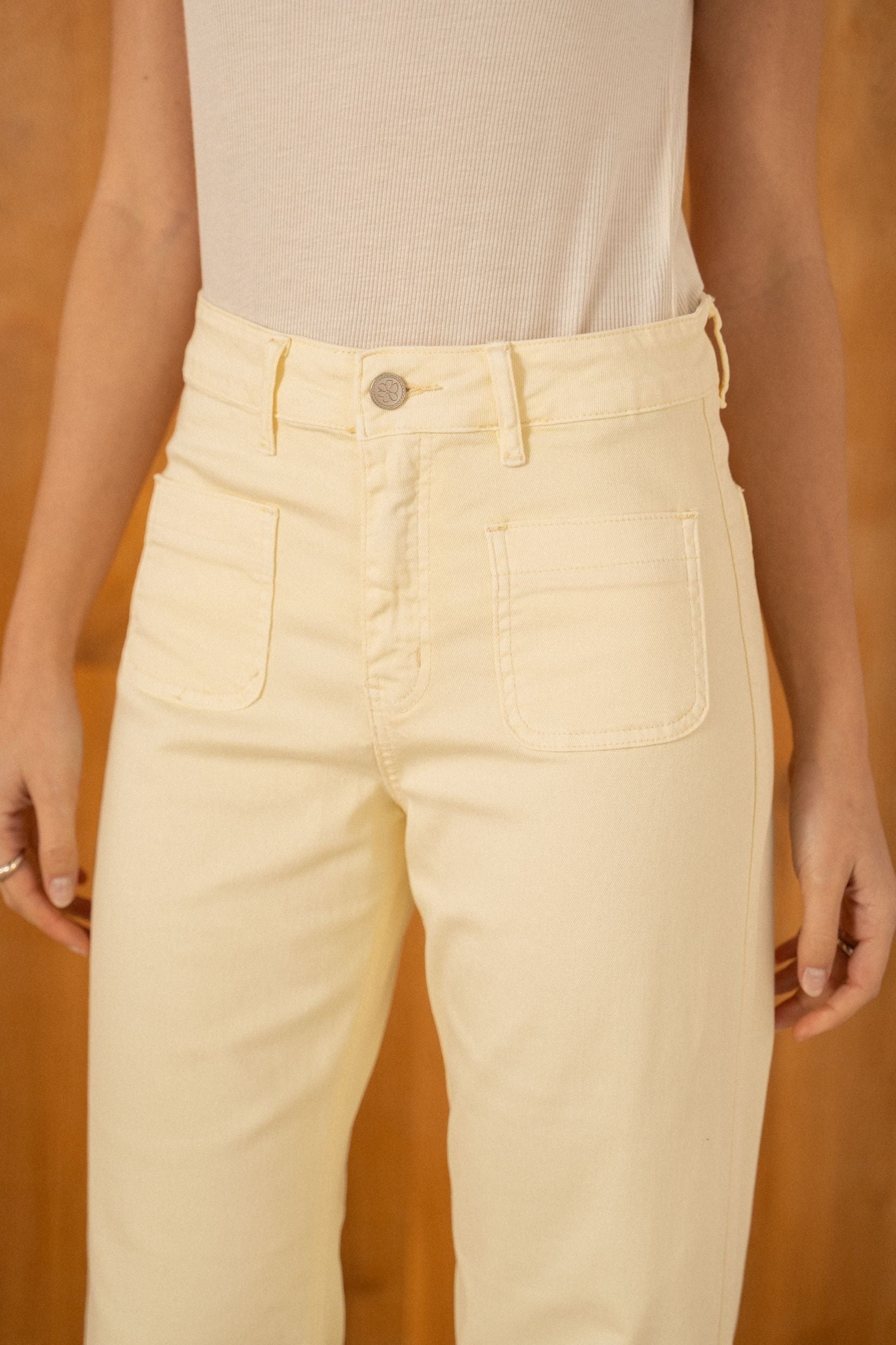 Détails : Denim jaune citron lumineux qui apporte fraîcheur et originalité. Deux grandes poches plaquées à l’avant ajoutent une touche rétro et structurent la ligne du pantalon.