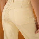 Avec sa teinte douce et sa coupe wide flare, ce pantalon apporte une touche lumineuse et moderne au vestiaire estival.