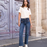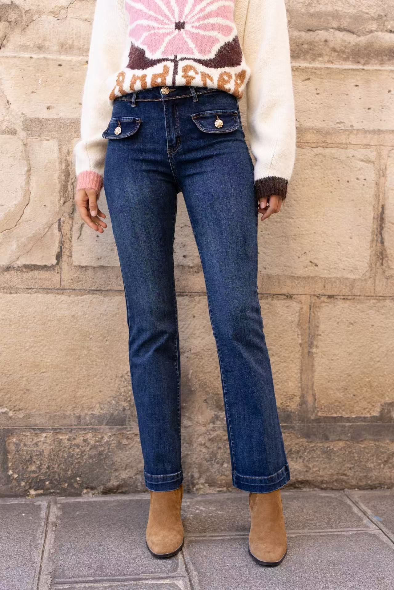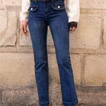 Schwarze Schlagjeans mit zwei Pattentaschen und goldenen Kantendetails. Sein Schnitt verlängert die Silhouette.