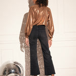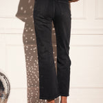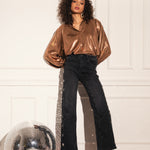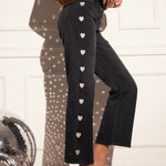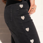 Weit geschnittene Hose in einem eleganten, verblassten schwarzen Denim-Farbton, verziert mit silbernen, gestickten Herzen an der Seite. Eine Kombination aus Originalität und Komfort.