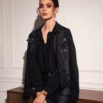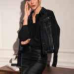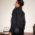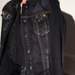 Gewaschene, anthrazitfarbene Stretch-Jeansjacke mit Paillettentaschen, aufgestickten Perlen und kleinen Strasssteinen.