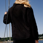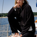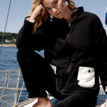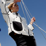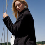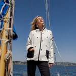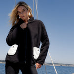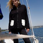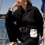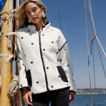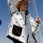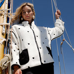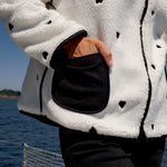 Détails : Veste sherpa blanche imprimée de petits cœurs noirs, réversible en version noire avec poches écrues, fermeture zippée, finitions contrastées