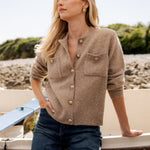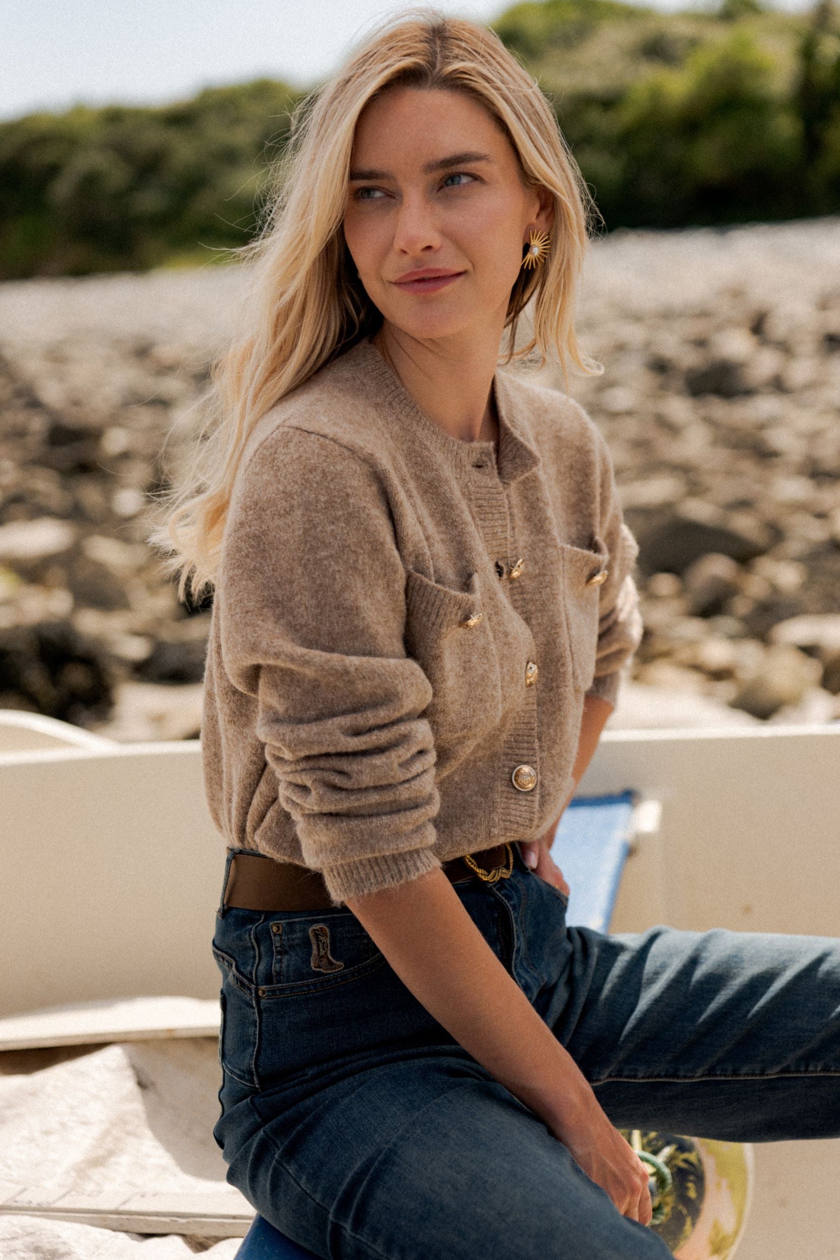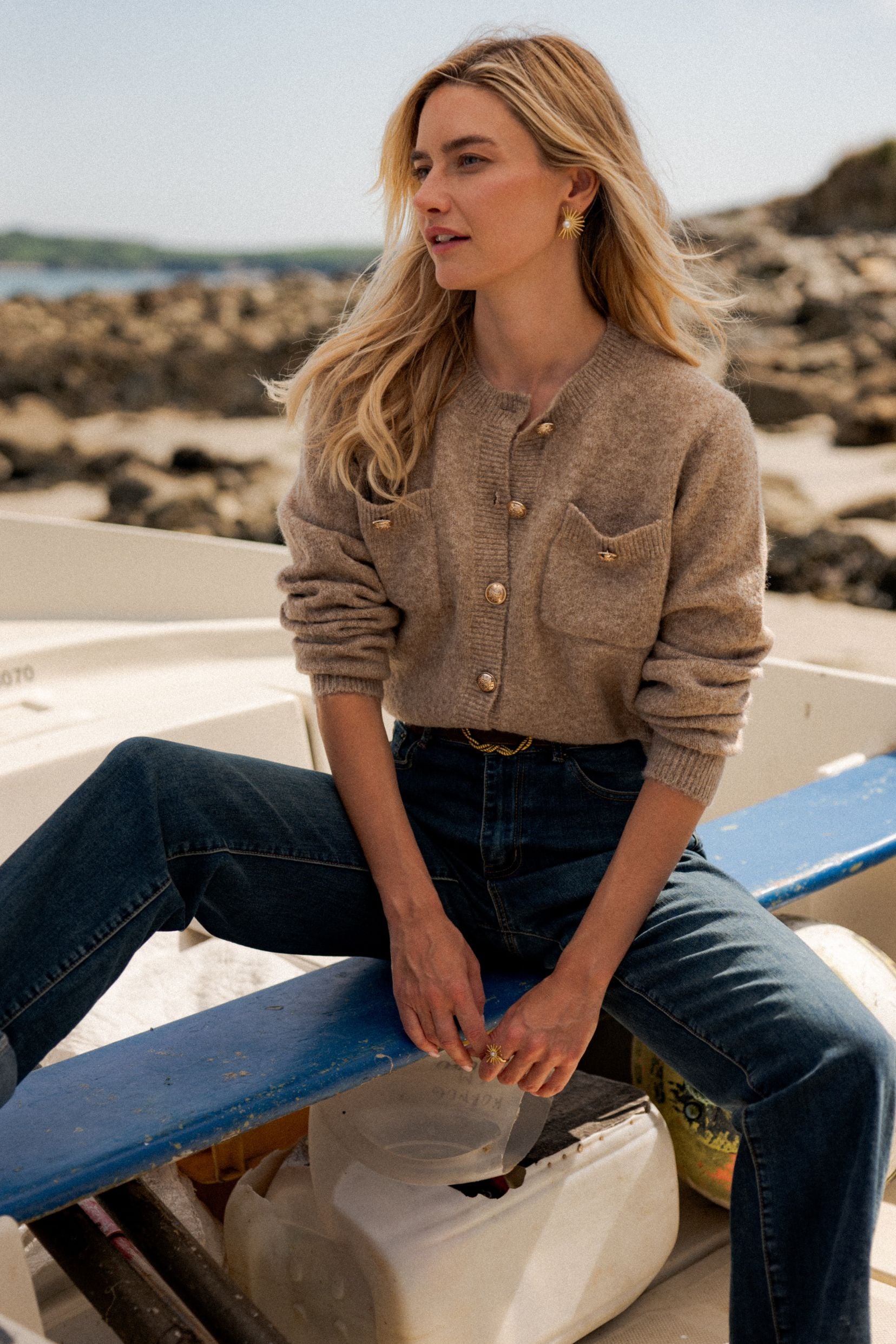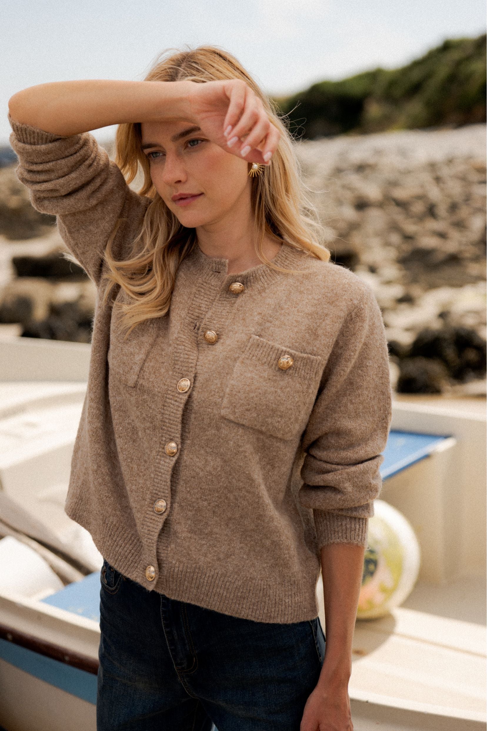 Détails : Deux poches plaquées subtilement soulignées par des boutons dorés esprit bijou, maille douce et confortable, finitions bord-côtes soignées.