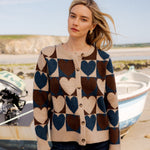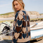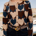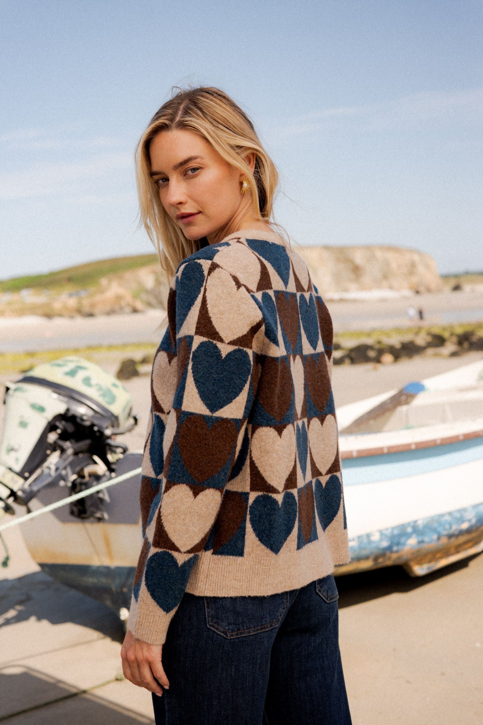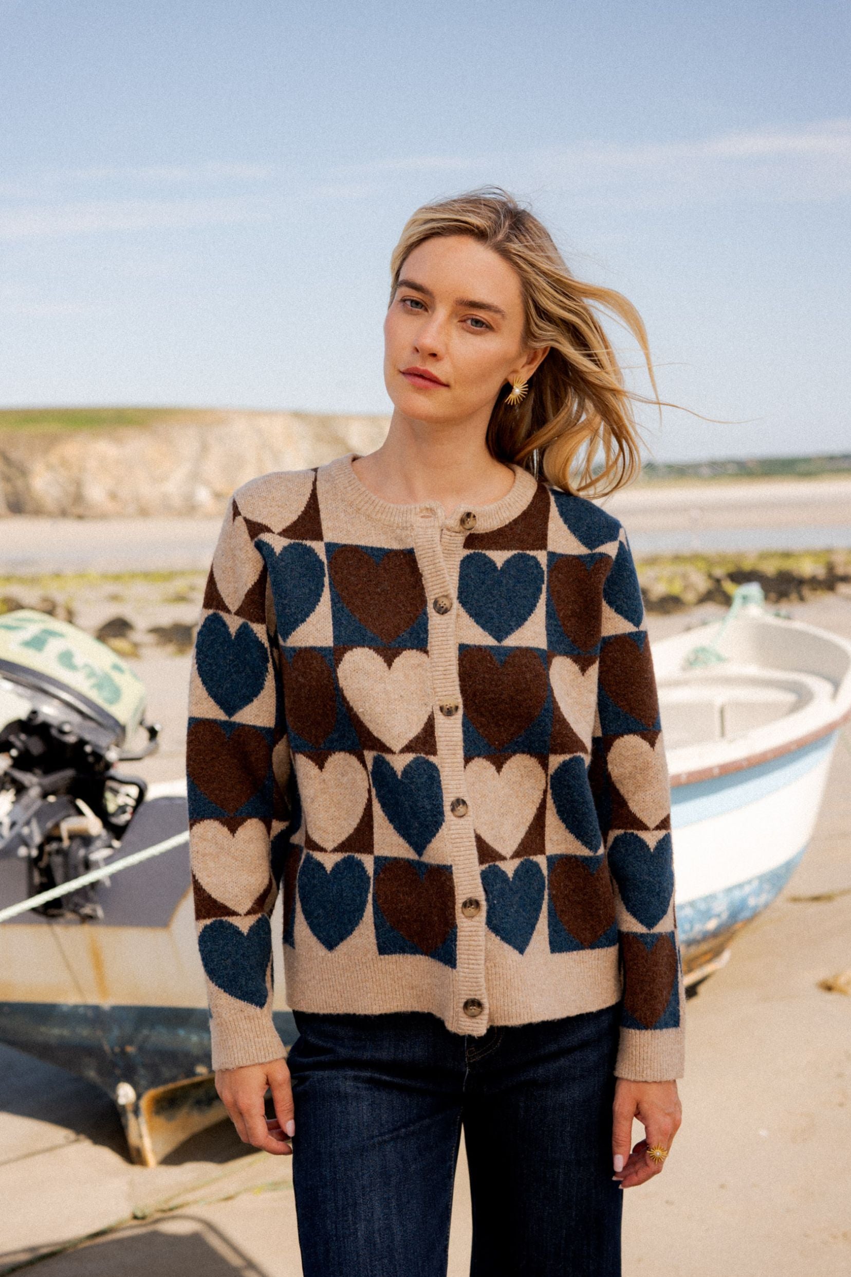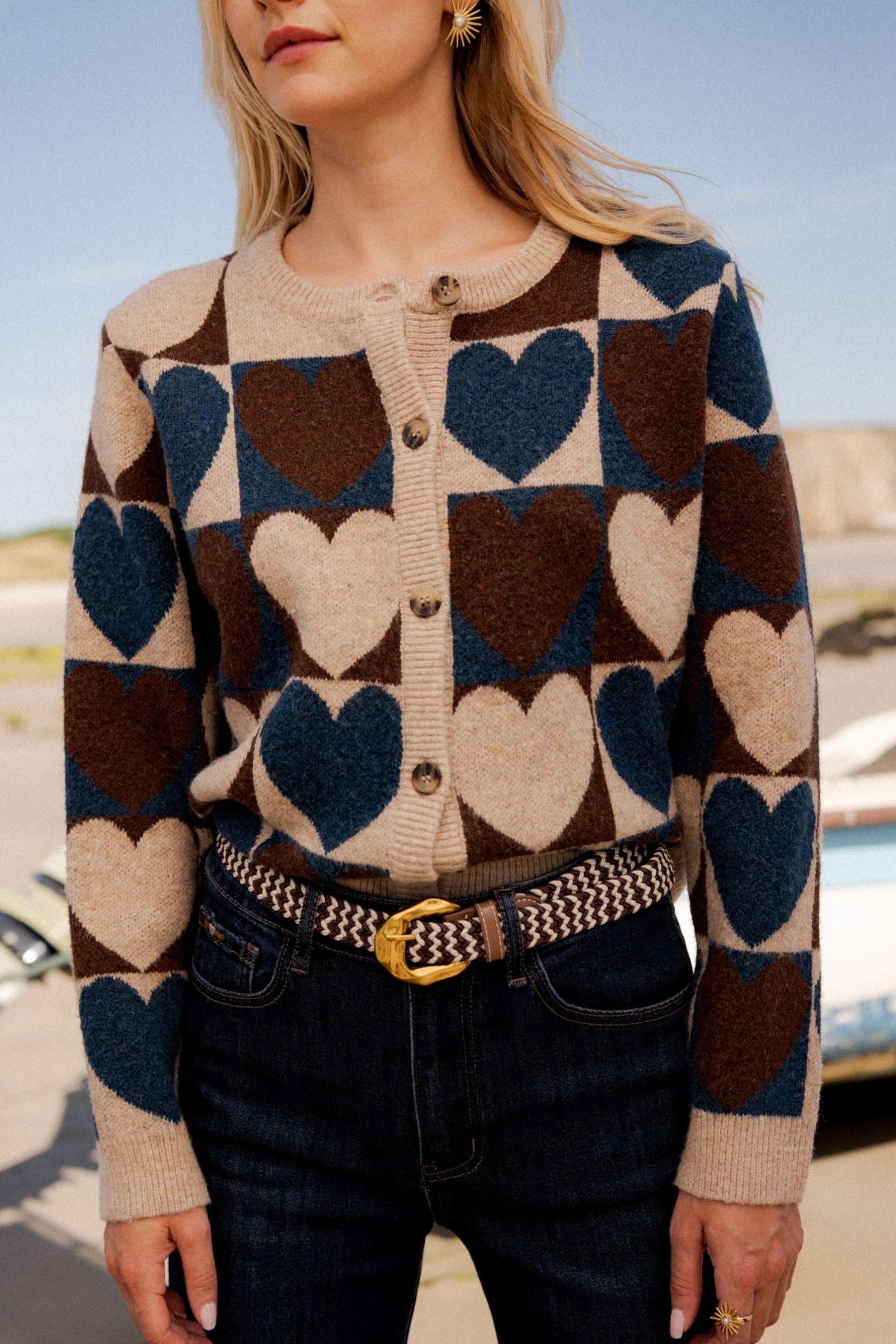 Détails : Maille moelleuse et légèrement duveteuse, jolis boutons cœurs dorés, col rond