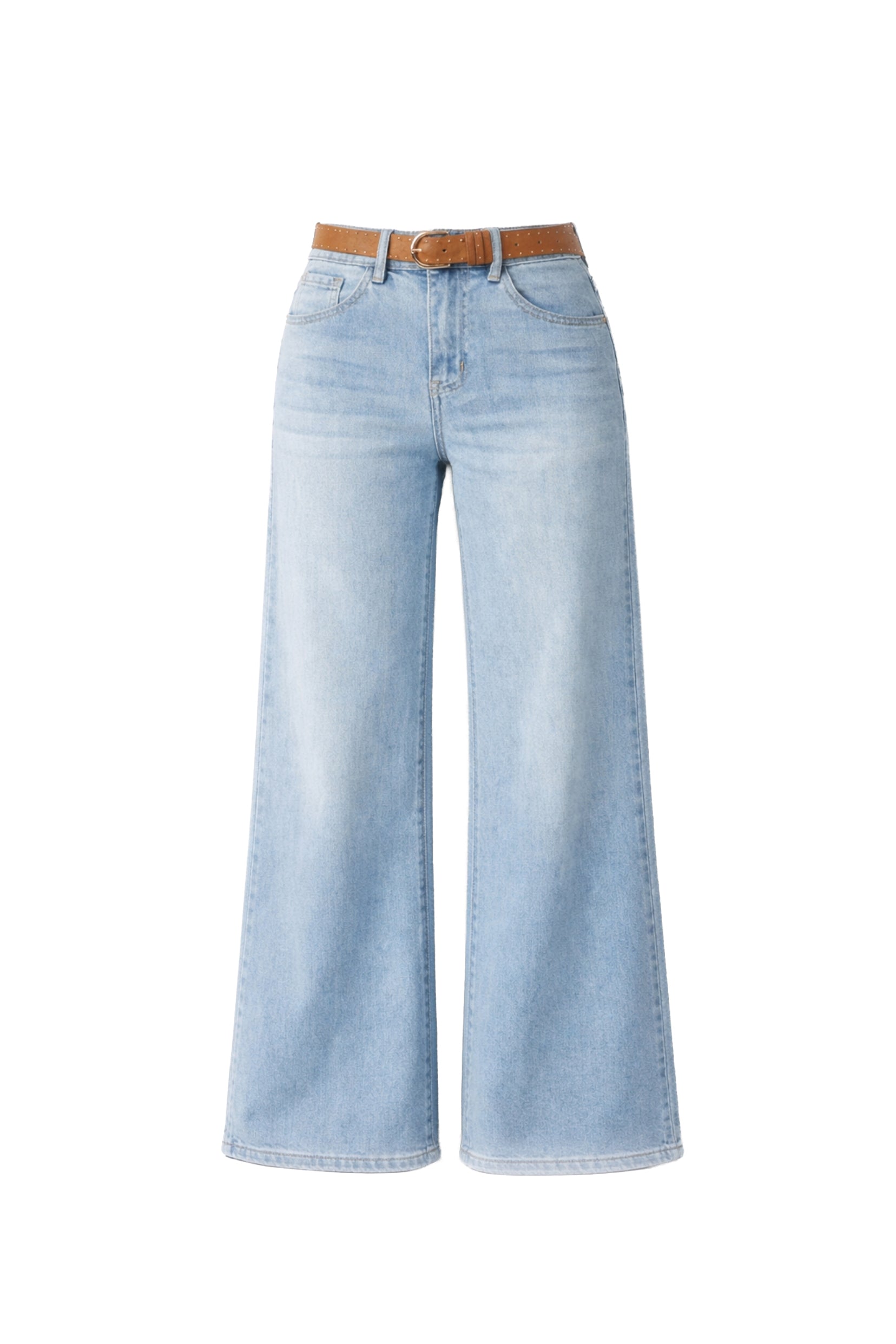 Détails : Denim bleu clair souple et très doux au toucher. Ce modèle est accompagné d’une ceinture cloutée incluse qui souligne la taille et apporte une touche de caractère.
