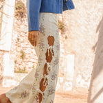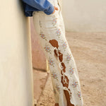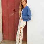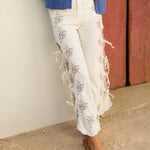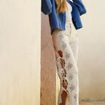 Avec ses broderies florales et ses détails lacérés sur les côtés, ce pantalon mêle esprit bohème et silhouette moderne.