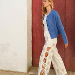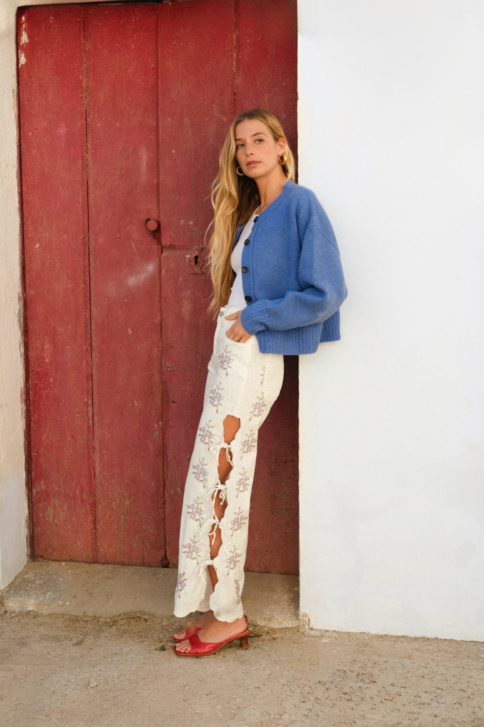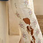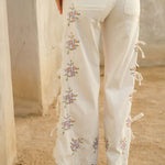 Détails : Denim écru toile fine, orné de broderies florales délicates réparties le long de la jambe. Les côtés du pantalon sont lacérés et reliés par des liens qui créent un jeu d’ouverture subtil et apportent une touche originale. Bas de jambe délicatement festonné pour une finition féminine.