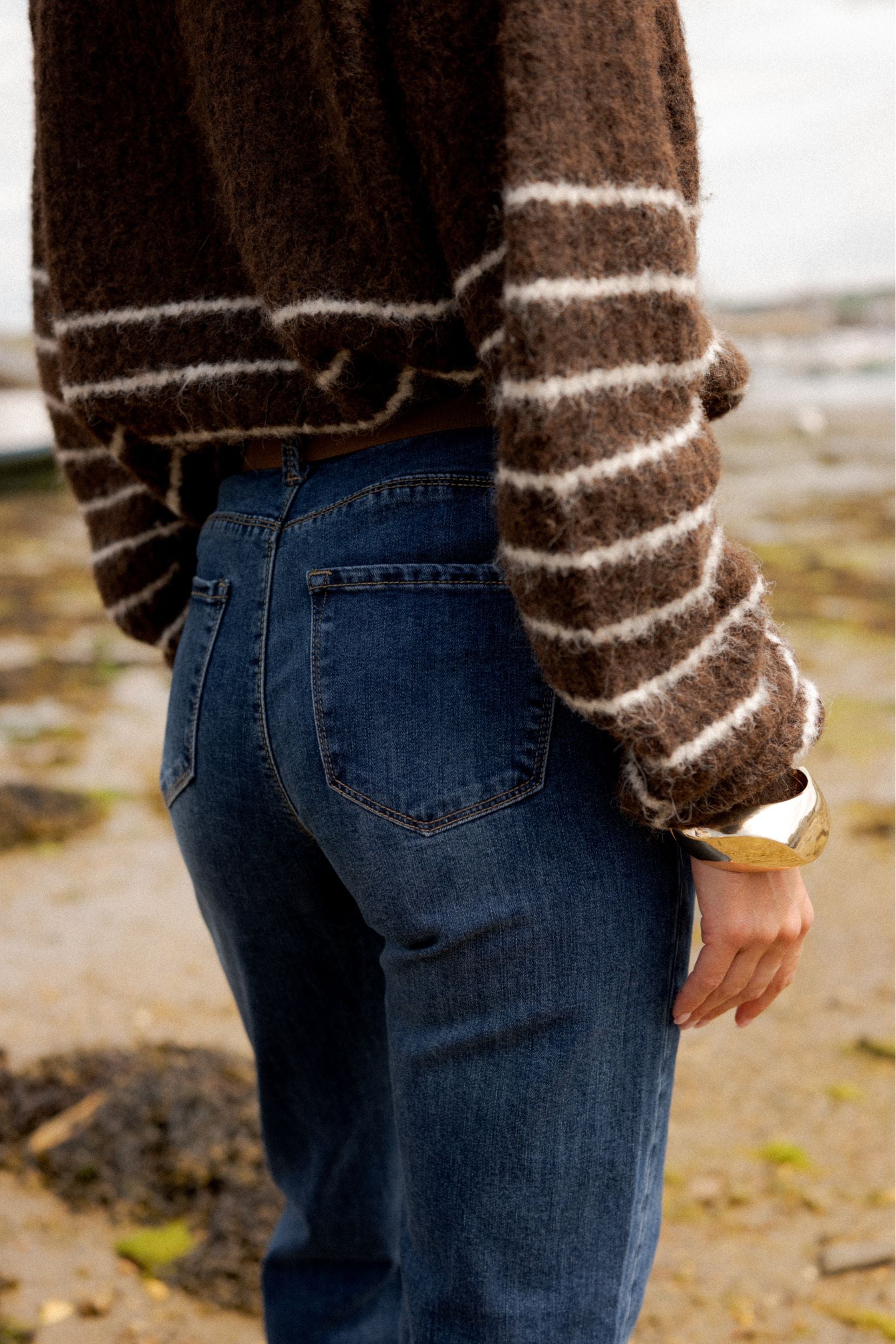 Détails : Denim brut à la teinte authentique, ceinture fournie pour souligner la taille, finitions soignées.