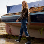 Coupe : Taille haute, jambe droite et bas retroussé pour un tombé structuré sans effort.