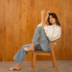 Coupe : Pantalon en jean taille haute à la coupe droite légèrement évasée, longueur cheville pour une silhouette élancée et féminine.