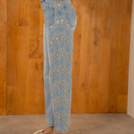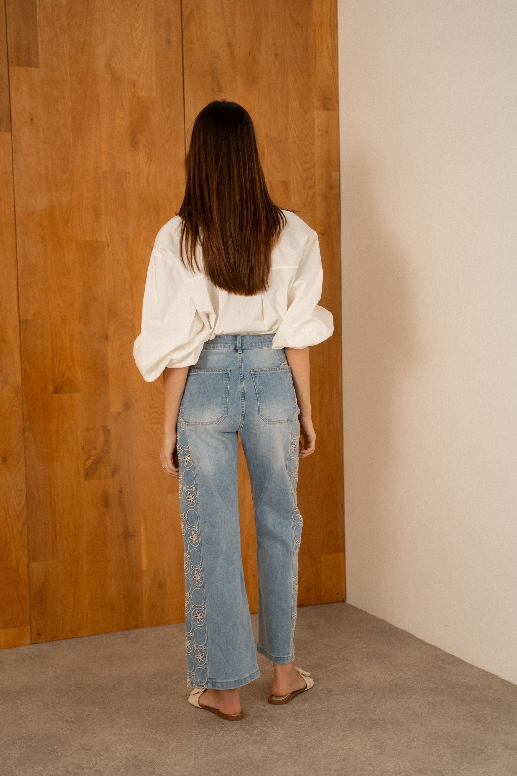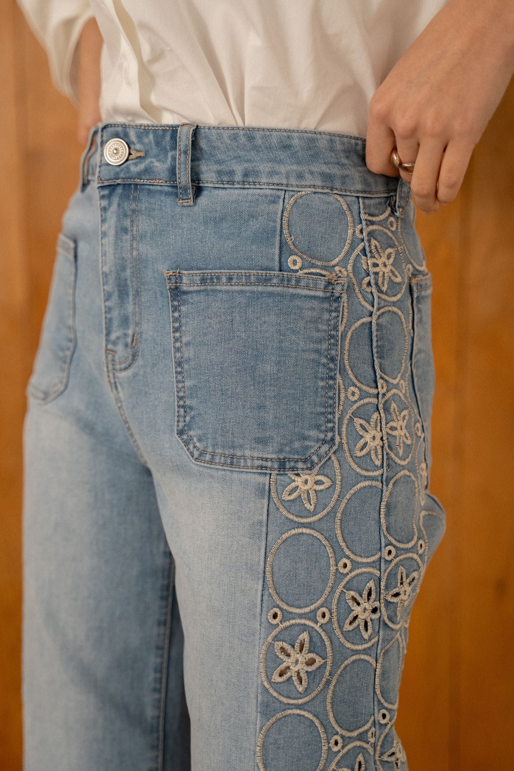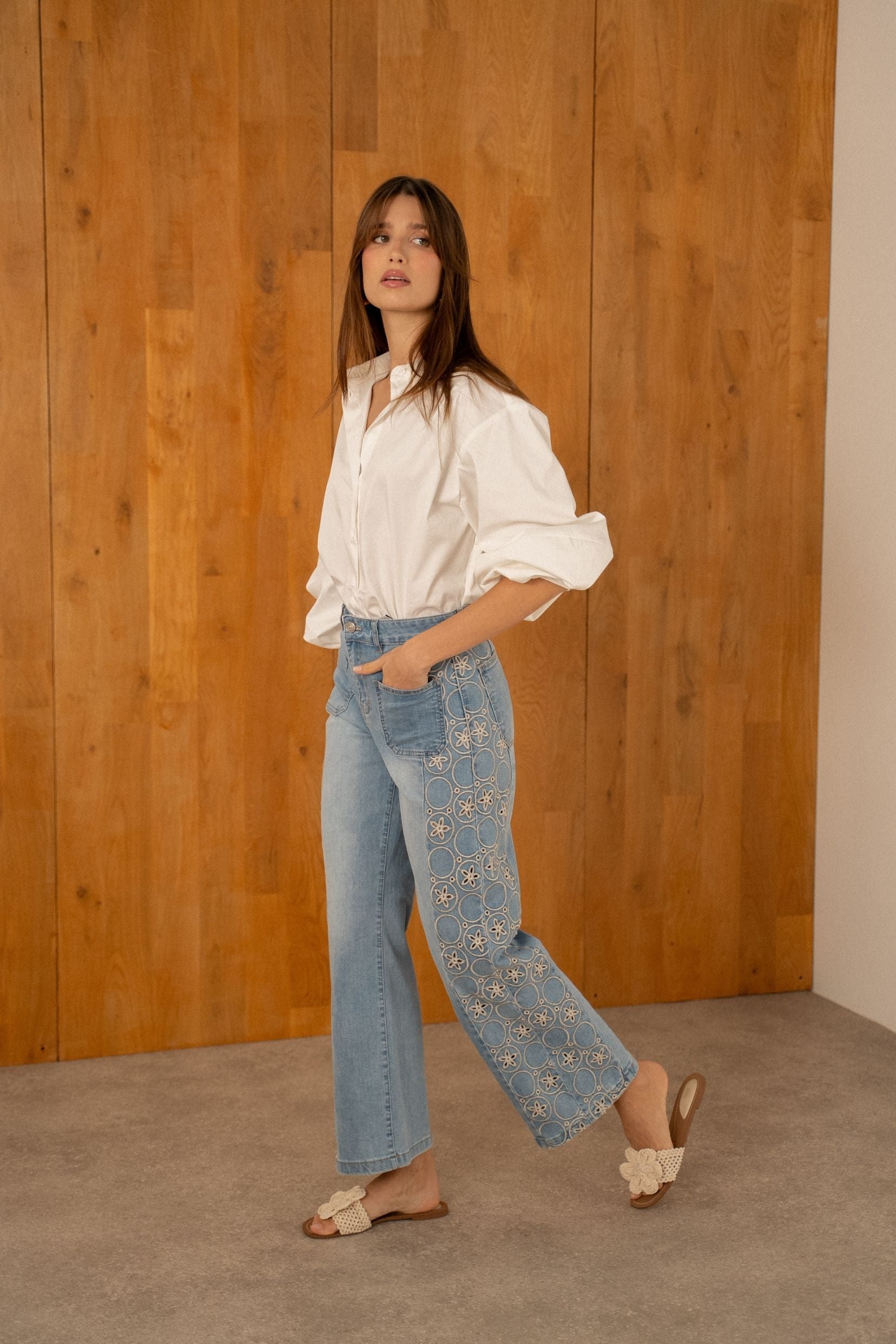 Détails : Denim bleu clair lumineux. Grandes poches plaquées à l’avant pour une touche vintage. Sur le côté de la jambe, une large bande brodée ajourée aux motifs floraux apporte relief et délicatesse à la pièce.