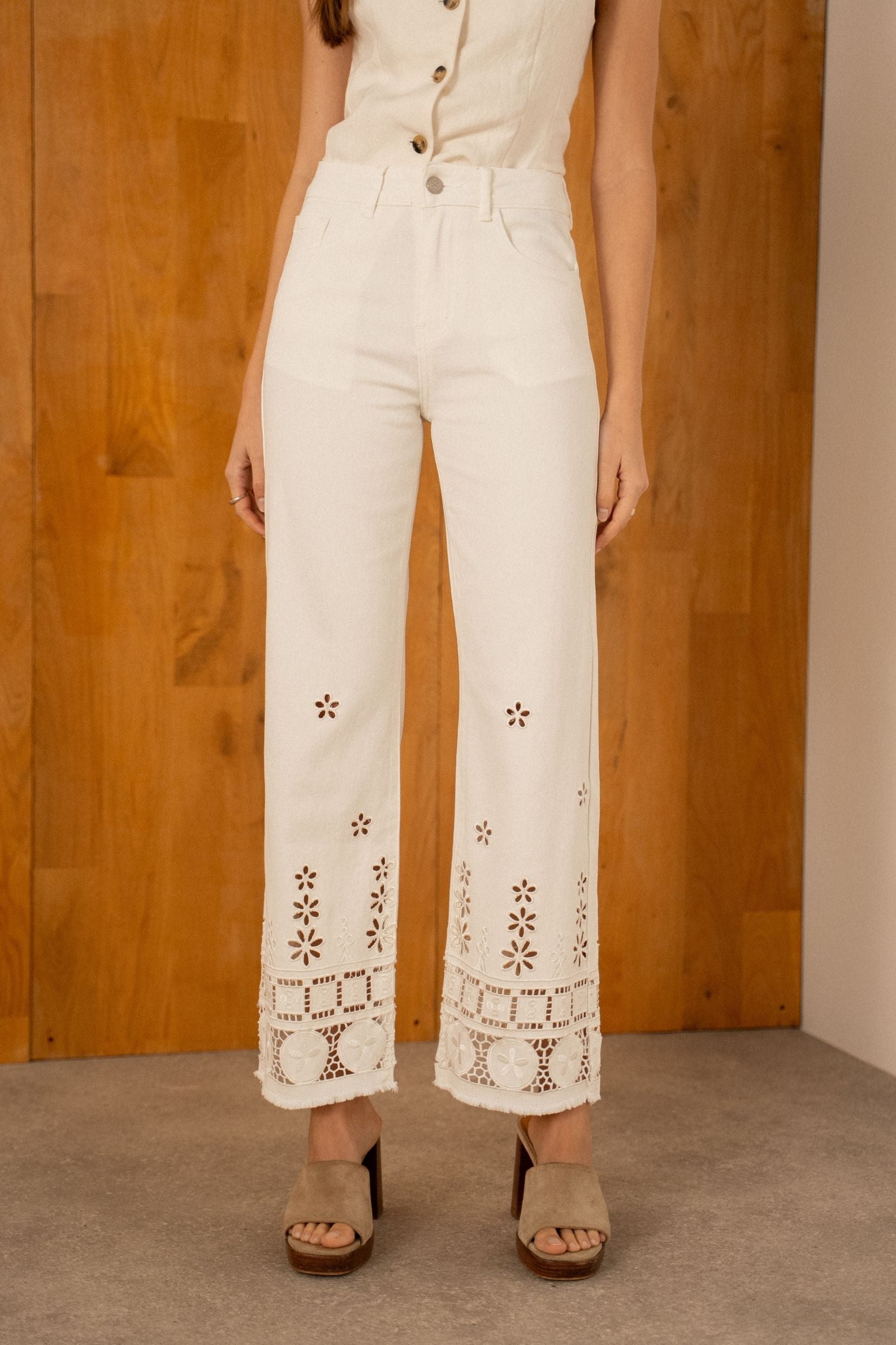 Détails : Denim écru orné de motifs floraux ajourés directement dans la matière. Le bas de jambe est travaillé avec des découpes ajourées graphiques qui donnent de la légèreté à la pièce et créent un effet délicat et estival.