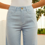 Ses rayures bleu ciel et bleu lavande, ponctuées de délicats strass, apportent une touche raffinée et moderne à la silhouette.